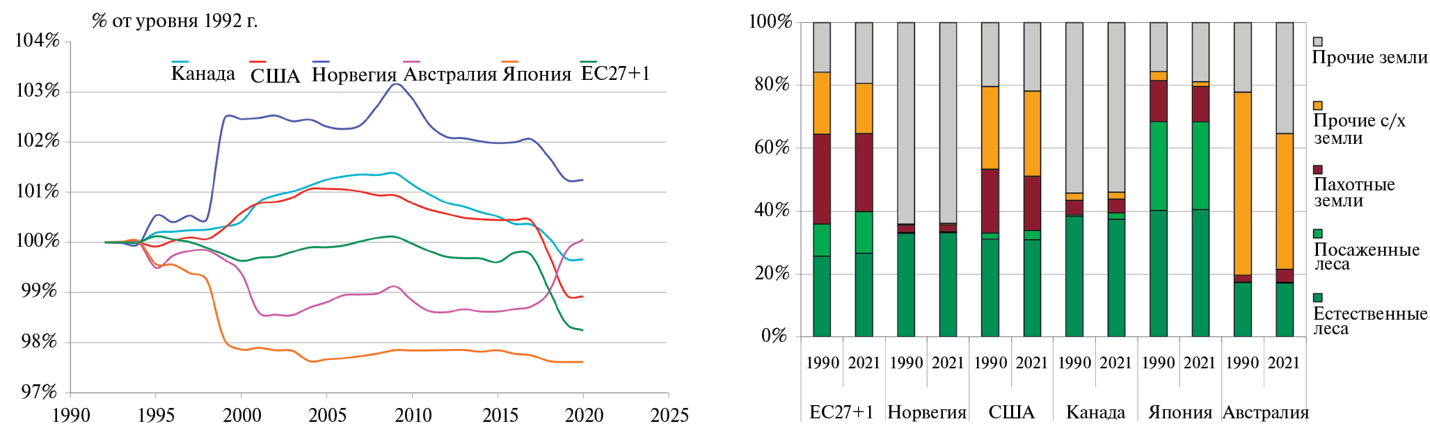 Однако ни данные дистанционного зондирования Земли (рис. 5а), ни результаты национальных инвентаризаций земельных ресурсов (рис. 5б) не свидетельствуют о каком-либо значимом увеличении площади лесных земель. Во всех странах, кроме Австралии, за период 1990–2021 гг. произошло некоторое (на 5–15%) сокращение площади пахотных земель, в Австралии за это время они почти удвоились. Площадь лесов на исследуемых территориях оставалась практически неизменной, лишь в ЕС по данным инвентаризации отмечен их рост более чем на 20%, причем треть современных европейских лесов – результат посадок при лесовосстановлении (в Японии – более 40%). При относительно стабильной площади лесов и постоянной замене ненарушенных массивов менее продуктивными посадками не приходится рассчитывать, что они примут на себя дополнительную нагрузку по поглощению углерода из атмосферы. Ситуация дополнительно осложняется необратимыми потерями углерода из пахотных земель, ежегодно теряемых в результате продолжающейся урбанизации в масштабах 16–33 тыс. км в год [28]. Детальные расчеты [29] показывают, что биосфера уже сегодня близка к пределу своих возможностей по депонированию углерода.