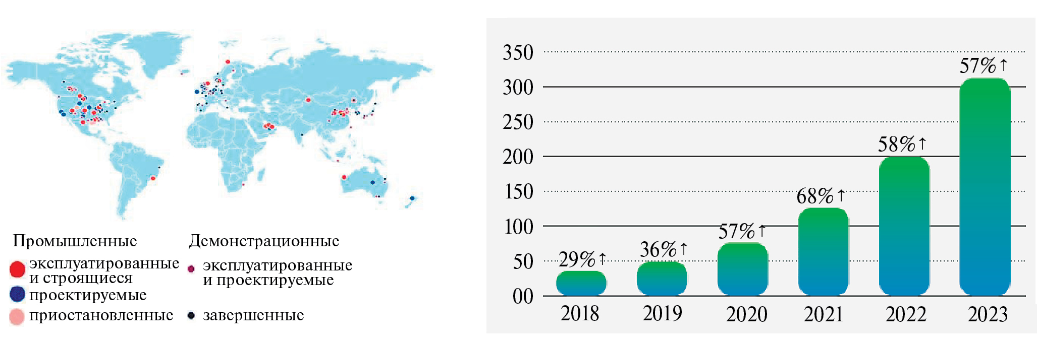 Рис. 6. Проекты по захоронению углекислого газа в мире в 2020 г. [30] и динамика их мощностей (млн т СО2/год) [31].