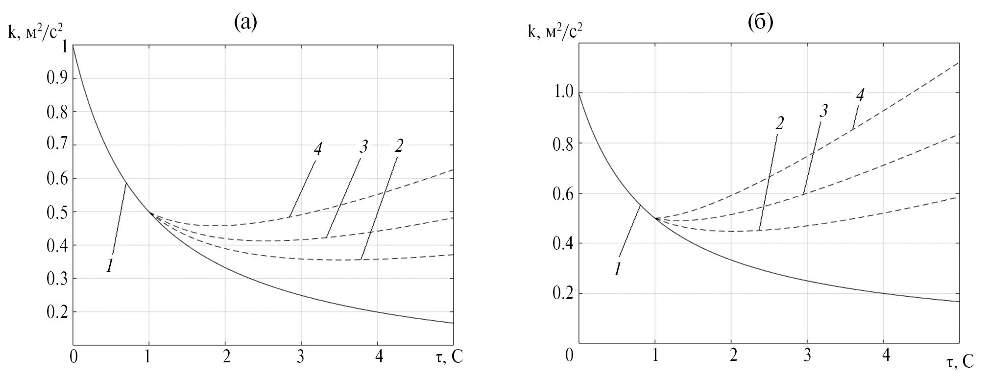 Рис. 1. Влияние присутствия крупных частиц на вырождающуюся однородную изотропную турбулентность: (а), (б). Цифрами обозначены: 1 – однофазное течение; 2 – двухфазное течение, м; двухфазное течение, 3 – двухфазное течение, м; 4 – двухфазное течение, м.