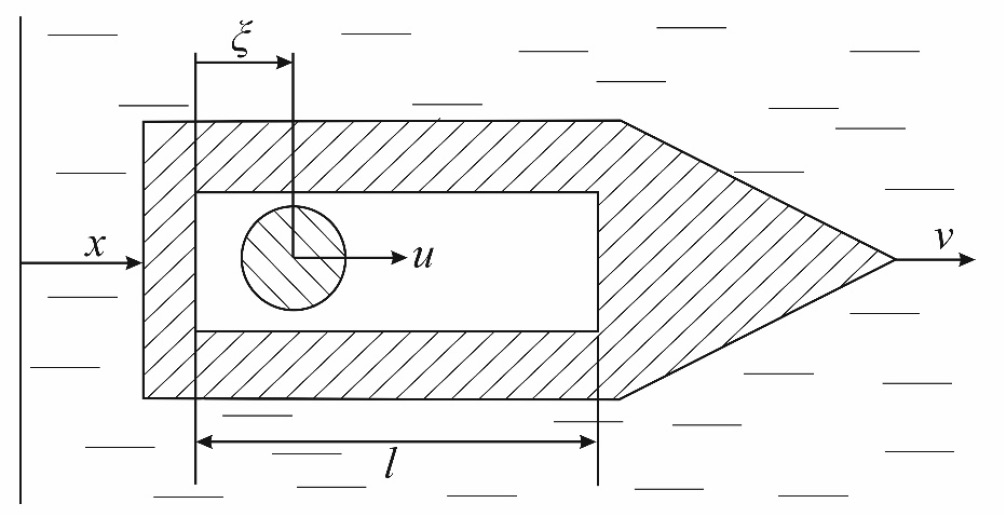 Ранее динамика подобной системы, управляемой при помощи внутренней массы, рассматривалась в ряде работ [8, 10, 11] в предположении, что управление задается кинематическим образом, т.е. путем выбора скорости движения внутренней массы относительно корпуса. При резком изменении относительной скорости внутренней массы в системе происходят удары, в частности, при достижении подвижной массой концов полости. Рассматриваемая в данной работе математическая модель, в которой управление осуществляется силой взаимодействия внутренней массы с корпусом, свободна от этого недостатка – здесь все скорости изменяются непрерывно.