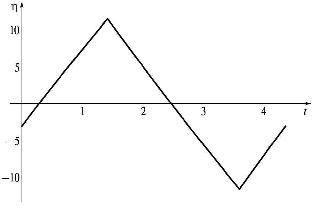 Будем рассматривать движения, при которых управление всегда максимально по величине и принимает одно из крайних значений Без нарушения общности полагаем, что на начальном участке, и при этом . Периодическое изменение скорости будет построено в соответствии со схемой, представленной на рис. 2, где моменты времени , удовлетворяющие неравенствам