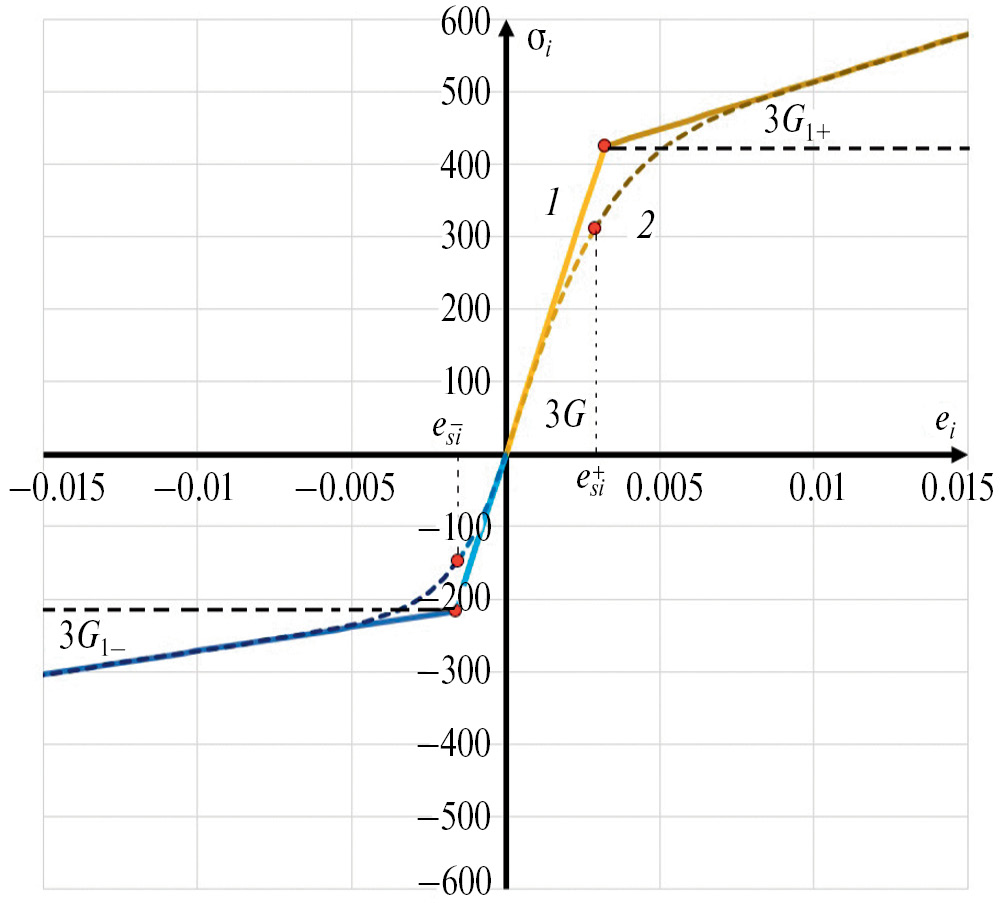 Численное исследование проведено для пластинки из серого железа, шарнирно опертой по контуру, при действии равномерно распределенной нагрузки q(x, y) = q. Для моделирования упругопластического изгиба применялись диаграммы для бимодульного материала, где ei – интенсивность деформации. На рис. 3 изображены две аппроксимации зависимости интенсивности напряжений от интенсивности деформации для серого железа. Модель 2 взята из работы [17], она построена по точкам с использованием кубической интерполяции. Модель 1 представляет собой аппроксимацию модели 2 в виде ломаных линий, описывающие физические данные аппроксимации представлены в табл. 1. Красными точками обозначен переход от линейной задачи к физически нелинейной (предел деформаций – при растяжении, – при сжатии).