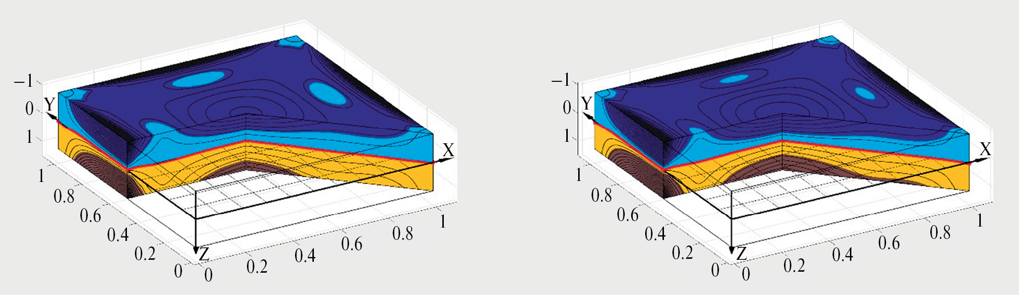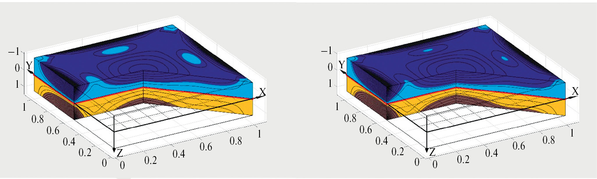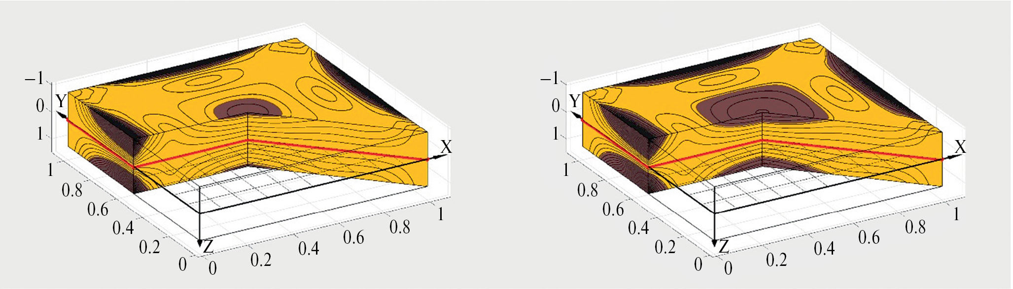 На рис. 5–8 представлены распределения интенсивности деформации ei по всей пластинке для значения нагрузки q = 120, указанного на рис. 4. На всех рисунках слева изображена пластинка с аппроксимацией, соответствующей сплошной линии графика, а справа – соответствующей штриховой. На рис. 5 представлены распределения ei в пластинке из одномодульного материала, а на рис. 6–8 показаны распределения ei в пластинке из бимодульного материала. На рис. 7 и 8 показаны распределения ei в пластинке из бимодульного материала и с учетом смещения нейтральной поверхности в разной проекции.