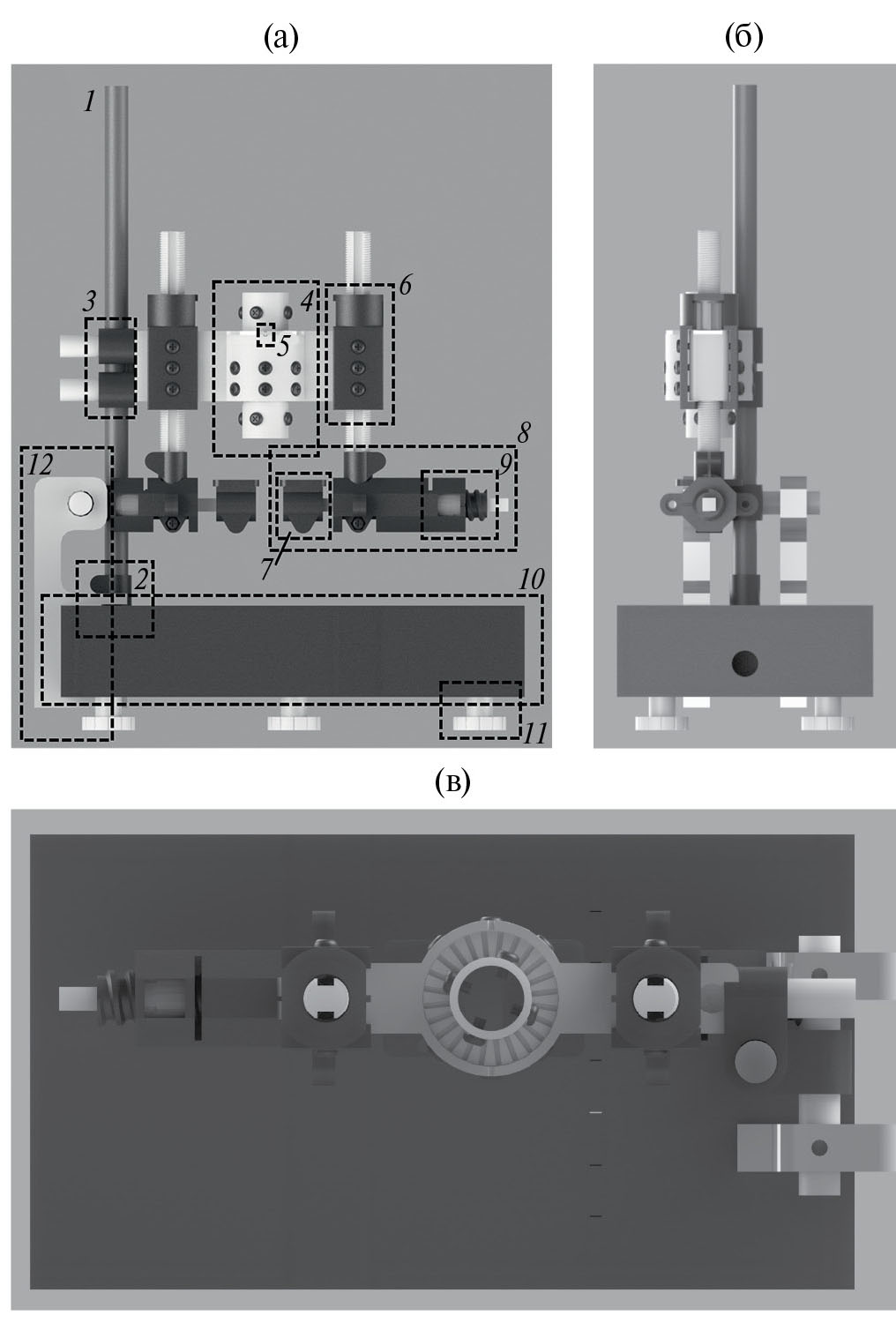 Рис. 1. Модель устройства: вид спереди (а), вид сбоку (б), вид сверху (в); 1 – шток; 2 – крепежный элемент; 3 – фиксатор; 4 – втулка для крепления исследуемого объекта (электрода); 5 – канавка для выставления угла поворота; 6 – муфта для вертикального перемещения предметных столиков; 7 – предметный столик; 8 – механизм горизонтальной юстировки; 9 – муфта для горизонтального перемещения предметных столиков; 10 – платформа; 11 – юстировочные ножки; 12 – компенсационный элемент.