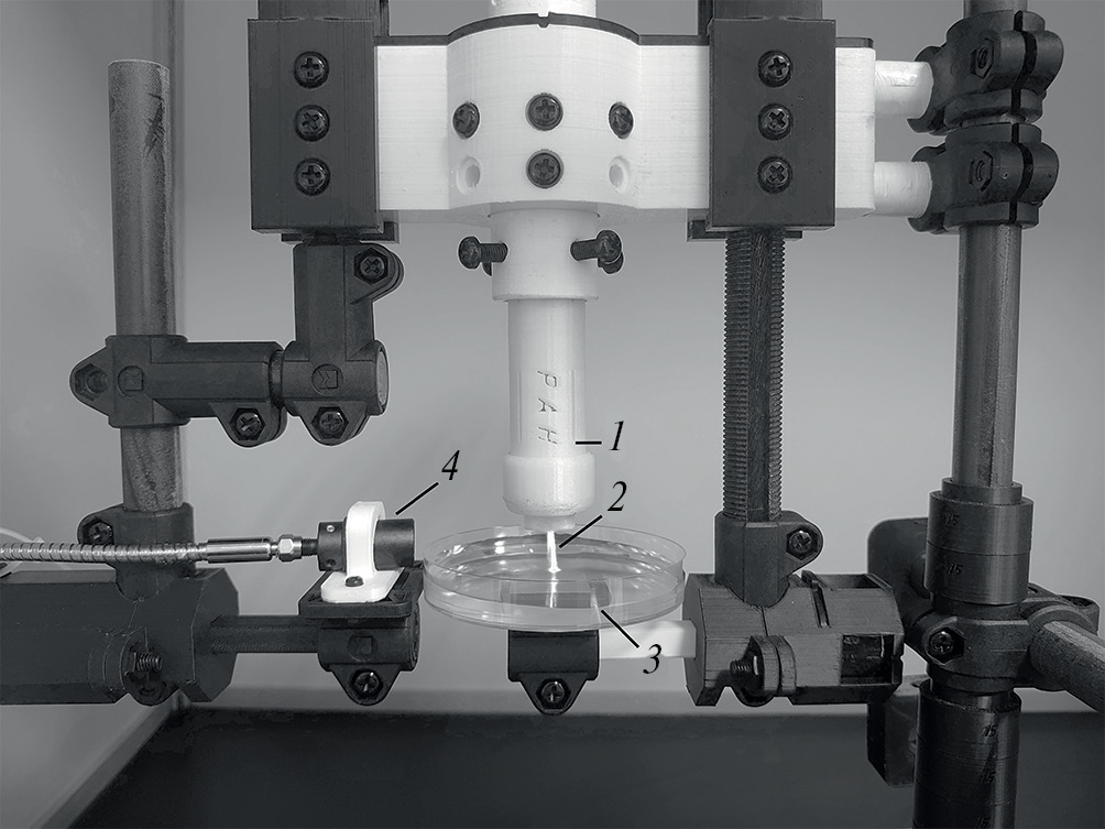 Как показывают многочисленные исследования, результаты взаимодействия НТП с биологическими объектами и жидкостями могут вызывать разнообразные отклики и варьироваться в самых широких пределах, что зависит от большого числа параметров как источников НТП, так и условий проведения обработки [8, 9]. Одними из ключевых факторов, определяющих результат прямого взаимодействия НТП с клетками или биотканями и его воспроизводимость, являются энергетические характеристики НТП (вкладываемая в разряд энергия, мощность и длительность микроразрядов), дистанция между активным электродом, задающим плазменное воздействие, и обрабатываемым объектом. Таким образом, на стадии разработки методик и протоколов обработки критически важным является прецизионное позиционирование рабочего устройства источника НТП, а также регистрация характеристик плазменного образования: спектры свечения плазмы и спектры поглощения УФ-излучения в обрабатываемой среде для определения скорости наработки биологически активных соединений; распределение электрического поля; величина и длительность тока в разрядных каналах и т.п. [10−16]. Для решения данного ряда задач нами было разработано и изготовлено универсальное устройство, позволяющее как позиционировать электроды различных типов источников НТП относительно объекта обработки, так и размещать вблизи них компоненты измерительной аппаратуры.