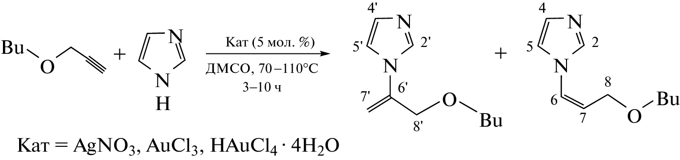 It has been shown that imidazole is added to the triple bond of 3-butoxypropine under the action of catalytic amounts (5 mol %) of silver salts to form a mixture of α- and β-isomers: 1-(3-butoxyprop-1-en-2-yl)-imidazole and 1-[(Z)-3-butoxyprop-1-en-1-yl)]-imidazole.