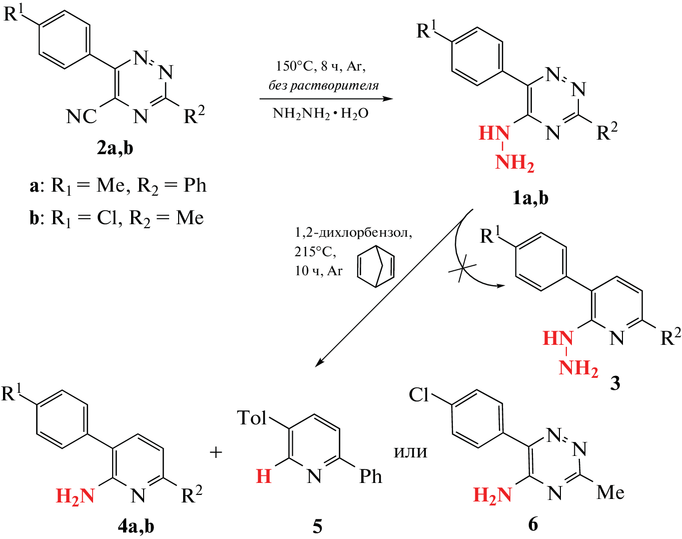 The interaction between 5-hydrazinyl-substituted 1,2,4-triazines and 2,5-norbornadiene at elevated temperature and pressure (in autoclave) have been studied. The 2-aminopyridines, 5-amino-1,2,4-triazines and 6-unsubstituted pyridines are the products of this reaction. The formation of last two products depends on the substituent at C3 position of the triazine.