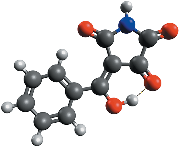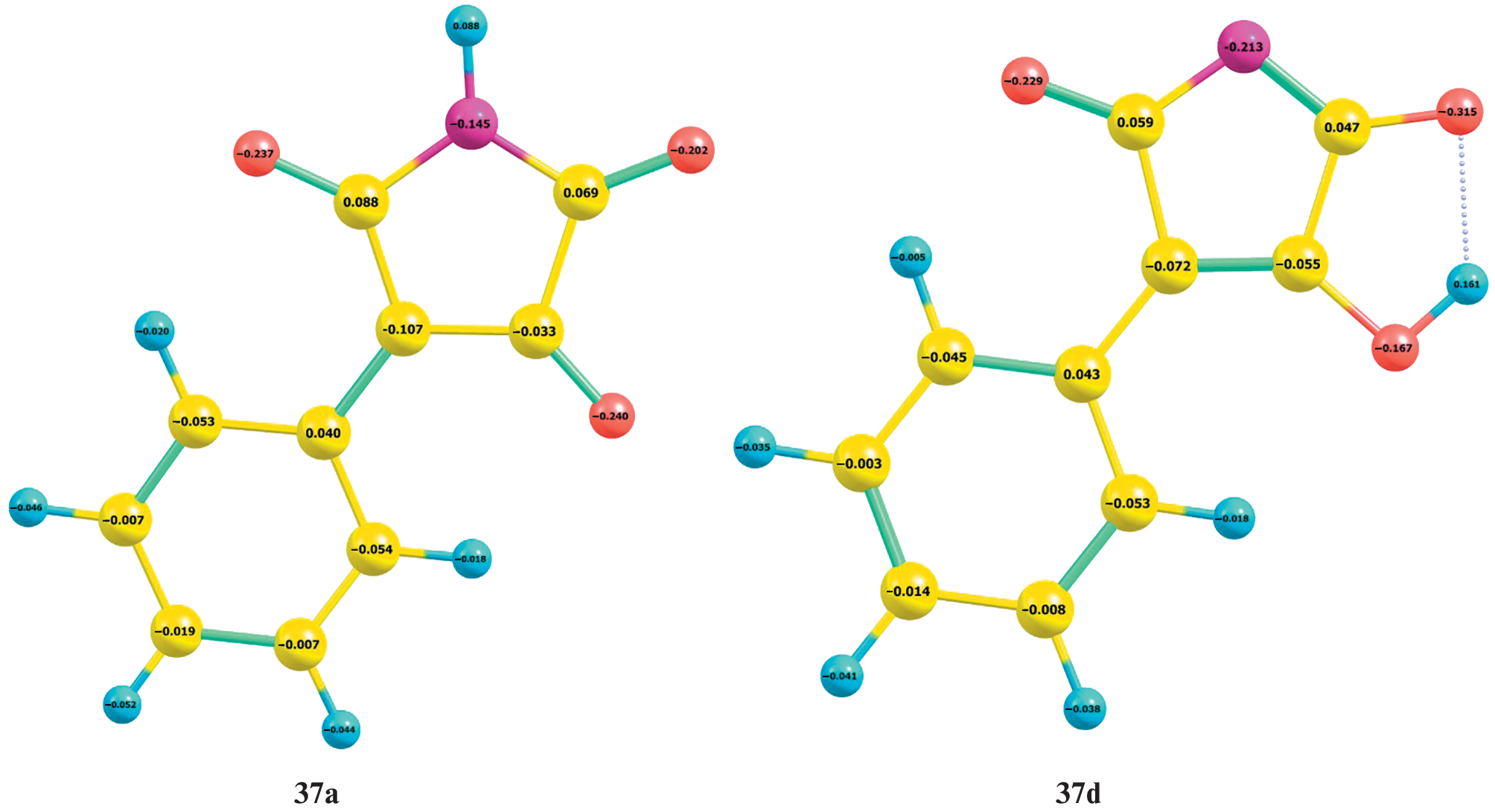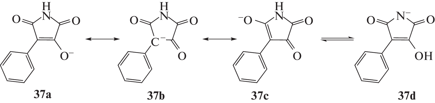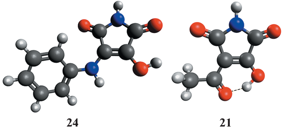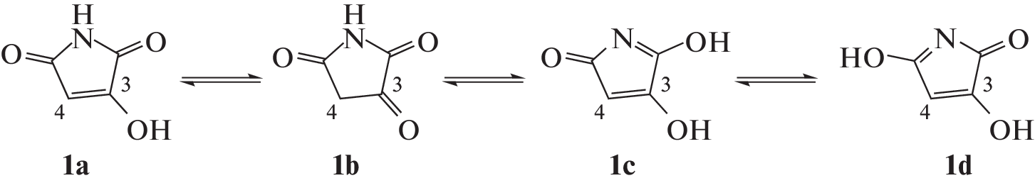 For 36 3-hydroxymaleimide derivatives energies of enol and keto forms were calculated by DFT method. The results clearly show that with only few exceptions, enol form is energetically more favourable by 16–60 kJ mol–1, with energy difference depending on 4-substituent. Global electrophilic index was calculated for all the compounds in question, showing that keto form is generally more electrophilic, with electrophilicity strongly dependending on 4-substituent. Two possible structures of hydroxymaleimide anion were evaluated, with deprotonated oxygen atom being the most energetically favourable.