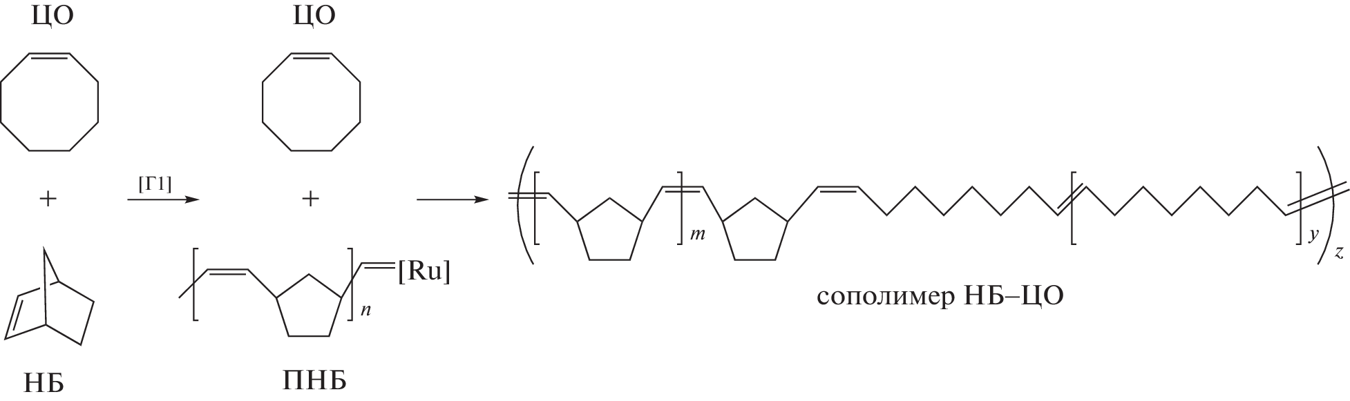 The one-pot synthesis of random multiblock copolymers of norbornene and cyclooctene has been performed for the first time. It is shown that the first generation Grubbs Ru-carbene complex makes it possible to obtain these copolymers directly from monomers. In the course of one-pot synthesis, the metathesis polymerization of norbornene, which has a markedly higher ring strain, occurs first. Then, cyclooctene polymerizes and simultaneously an interchain cross-metathesis reaction takes place, during which the block structure of the copolymer is formed. Compared to the previously studied interaction of polynorbornene and polycyclooctene, the one-pot method makes it possible to obtain copolymers with a higher molar mass at a lower catalyst consumption.