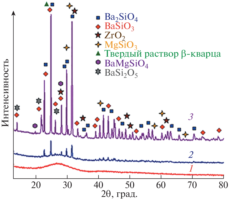 For the first time, an approach to designing the structure of Eu2+ containing silicate glass-ceramics materials has been experimentally implemented, which consists in the fact that rare earth activator is introduced into various crystals formed during glass crystallization. Transparent Eu-containing glass and glass ceramics based on the system BaO–ZrO2–SiO2–MgF2 were prepared by the traditional glass melting method at 1450°C. The crystal structure and properties of materials were characterized by XRD analysis and photoluminescence spectroscopy during different stages of glass crystallization. It is shown that the simultaneous incorporation of Eu into different silicate crystals (Ba2SiO4, BaMgSiO4, and BaSiO3) formed during the glass crystallization leads to the formation of a material with a wide luminescence band in the visible part of the spectrum. The study of photoluminescence and luminescence excitation spectra of the glass suggests the possibility of energy transfer from Eu2+ to Eu3+ ions. The structures of Eu2+ luminescent centers are similar in the glass and glass-ceramics that is related to some phase separation in the glass before crystallization. The study of luminescence properties of prepared materials showed that these materials can be promising for the application in LEDs techniques.