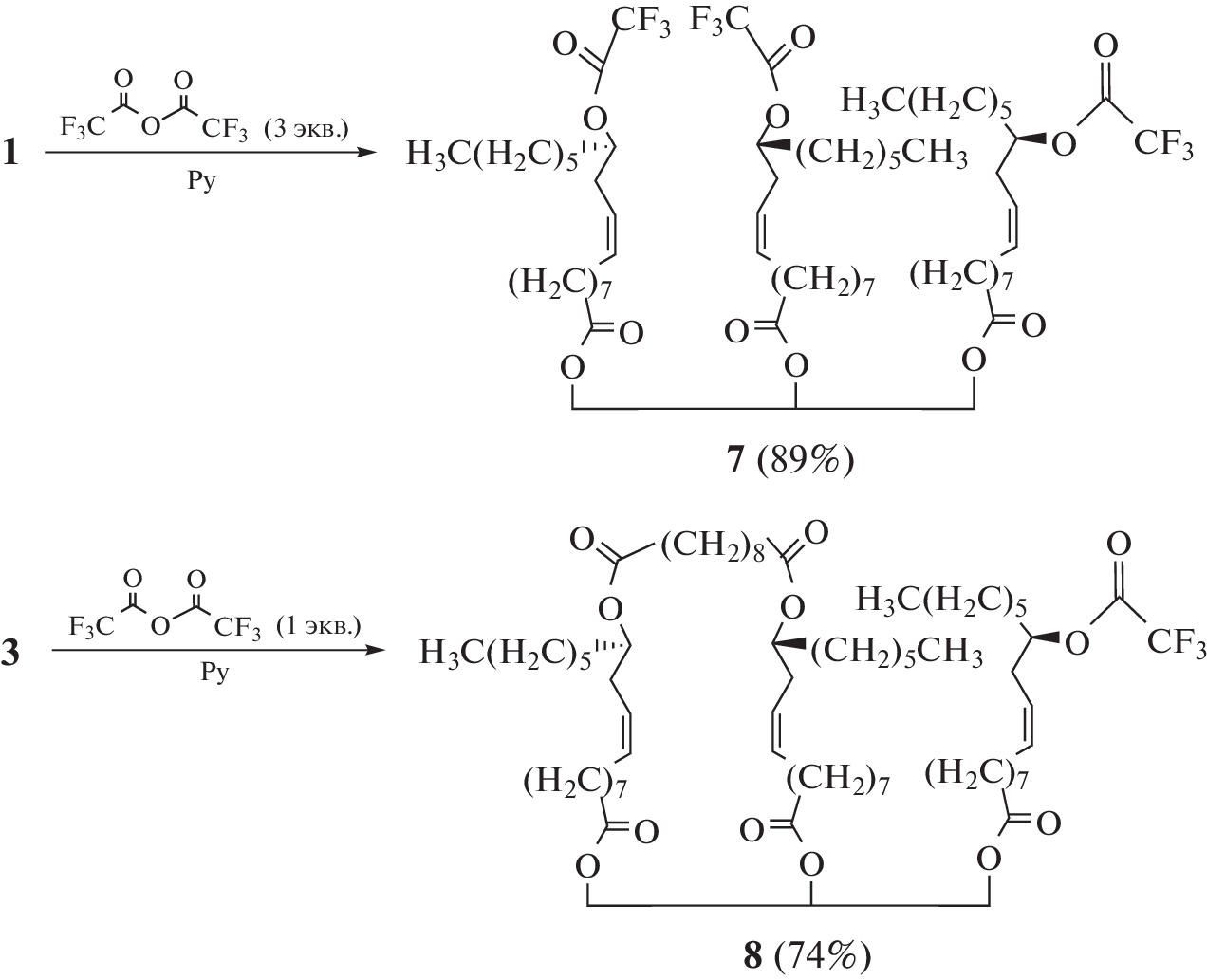 An effective synthesis of optically pure macrocyclic mono- and dinuclearpolylactones is proposed, based on the condensation of a natural triol – castor oil with sebacic acid dichloride, taken in ratios 1 : 1 or 1 : 2, in boiling carbon tetrachloride in the presence of triethylamine and the catalyst N,N-dimethylaminopyridine.