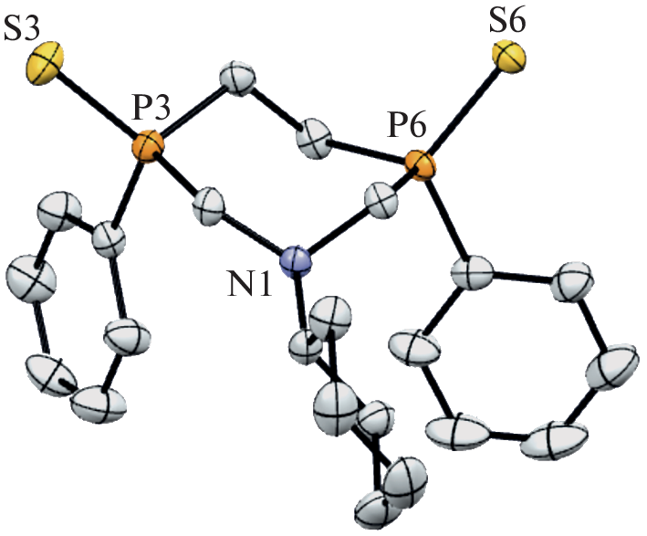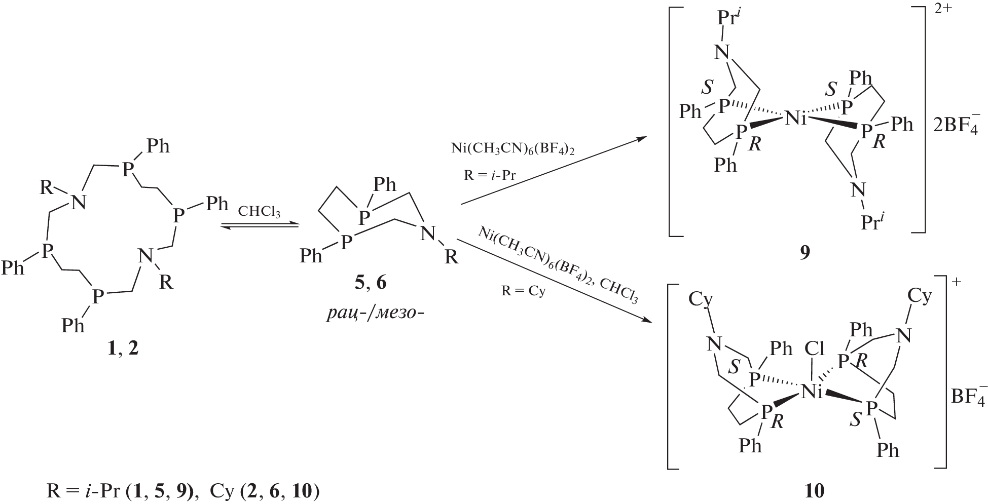 The approach to the synthesis of bis-phospninesulfides and nickel and platinum chelate complexes of 1,3,6-azadiphosphacycloheptanes is supposed. The approach is based on the ability of 14-membered 1,8-diaza-3,6,10,13-tetraphosphacyclotetradecanes undergo the reversible transformation to the mixture of meso- and rac-isomers of 7-membered bisphosphines during the solution. The reaction of 1,8-diaza-3,6,10,13-tetra-phosphacyclotetradecanes with elementary sulfur results in 14-membered tetra(phosphinesulfides) or 7‑membered bis(phosphinesulfides) that depends on the reaction conditions. The reaction of 1,3,6-azadiphosphacycloheptanes, forming by the reversible dissociation of 14-membered tetraphosphines in chloroform, with Ni(CH3CN)6(BF4)2 and Pt(COD)Cl2 give corresponding chelate complexes. The structures of meso-isomer of 1-cyclohexyl-3,6-diphenyl-1-aza-3,6-diphosphacycloheptan-3,6-disulfide 8, bis-(κ2-1-isopropyl-3,6-diphenyl-1-aza-3,6-diphosphacycloheptane)nickel bis(tetrafluoroborate) 9, bis-(κ2-1-icyclohexyl-3,6-diphenyl-1-aza-3,6-diphosphacycloheptane)chloronickel tetrafluoroborate 10 and cis-dichloro-(κ2-1-cyclohexyl-3,6-diphenyl-1-aza-3,6-diphosphacycloheptane)-platinum(II) 13 were established by single crystal XRD analysis.