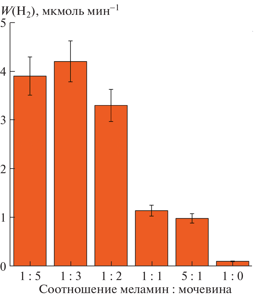 In this work, materials based on graphite-like carbon nitride were synthesized by thermal treatment of a mixture of melamine and urea and the effect of synthesis conditions on the photocatalytic activity of the samples was studied. As a cocatalyst, platinum (1 wt. %) was deposited on the surface of the synthesized g‑C3N4 samples. The photocatalysts were characterized by X-ray phase analysis, diffuse reflectance UV-vis spectro-scopy in the UV and visible range, and low-temperature nitrogen adsorption. Photocatalytic activity was determined in the reaction of hydrogen evolution from an aqueous solution of triethanolamine (10 vol. %) under visible light irradiation (λ = 425 nm). The optimal conditions for the synthesis of the photocatalyst 1% Pt/g-C3N4, obtained by calcination of a mixture of melamine and urea (1 : 3), were found, using which the rate of H2 evolution was 5.0 mmol g–1 h–1 with an apparent quantum efficiency of 2.5%. The developed synthetic approach makes it possible to obtain highly active catalysts due to the formation of an intermediate supramolecular melamine-cyanuric acid complex during the synthesis, which, upon further heating, turns into g-C3N4, which is characterized by a high specific surface area exceeding 100 m2 g–1.
