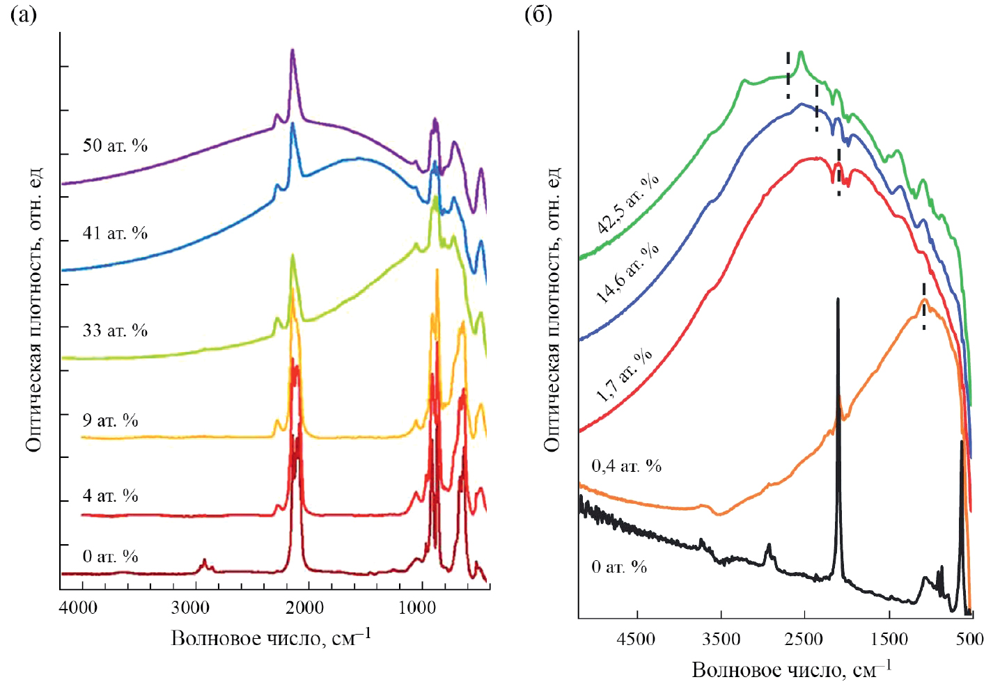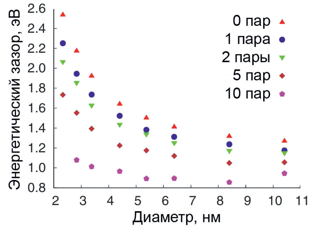 Совместное легирование бором и фосфором нч-Si диаметром от 2.9 до 7.3 нм также было реализовано методом ХОГФ и охарактеризовано качественно с помощью энергодисперсионной рентгеновской спектроскопии. В данном случае внедрение примеси дополнительно подтверждается коллоидной растворимостью в донорных растворителях, характерной для присутствия атомов бора на поверхности. Моделирование люминесцентных свойств, по результатам полуэмпирических расчетов [25] при условии отсутствия ЛПР, позволяет оценить среднее число атомов бора в наночастицах в 5–10, а фосфора – в 5–20, что в пересчете на УЛ составляет около 0.3 и 0.5 ат. % соответственно. При этом заложенные количества бора и фосфора в реакторе в данном случае составляли 4 и 13 ат. % относительно кремния соответственно [8].