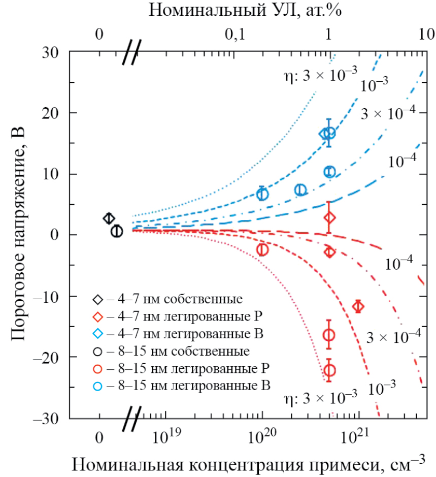 Несмотря на убедительную демонстрацию легирования, химический анализ долгое время проводили только для композитов нч-Si/диэлектрик в целом, а УЛ высчитывали косвенным путем. К примеру, для частиц размером 3.5 нм в матрице оксинитрида для примеси предполагают распределение Пуассона, а также тушение ФЛ при включении даже единичного атома фосфора. Падение интенсивности ФЛ в такой модели приводит к УЛ до 0.9 ат. % для образца со средним содержанием фосфора во всем композите 1.75 ат. %. С учетом объемной доли наночастиц только ~15% от всей примеси в образце находится в нч-Si [65]. Предположение биномиального распределения примеси позволяет рассчитать ее содержание в наночастицах из интенсивности сигнала ЭПР, соответствующего частицам с лишь одним нескомпенсированным атомом примеси. Для частиц средним диаметром 5 нм таким образом было определено, что отношение числа носителей заряда к общему количеству примеси в образце равно 30% и УЛ составляет не менее 0.12 ат. % [39].