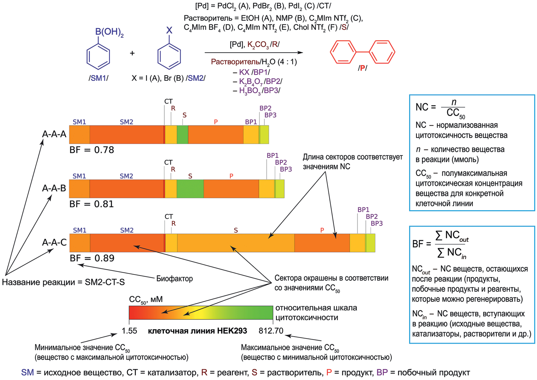 На рис. 1 представлены биострипы для трех путей синтеза 1,1′-бифенила, построенные на основании цитотоксичности веществ по отношению к клеточной линии HEK293. Длина секций биострипов равна “нормализованной цитотоксичности” (NC, normalized cytotoxicity) соответствующих веществ – исходных веществ, катализаторов, реагентов, растворителей, продуктов и побочных продуктов: