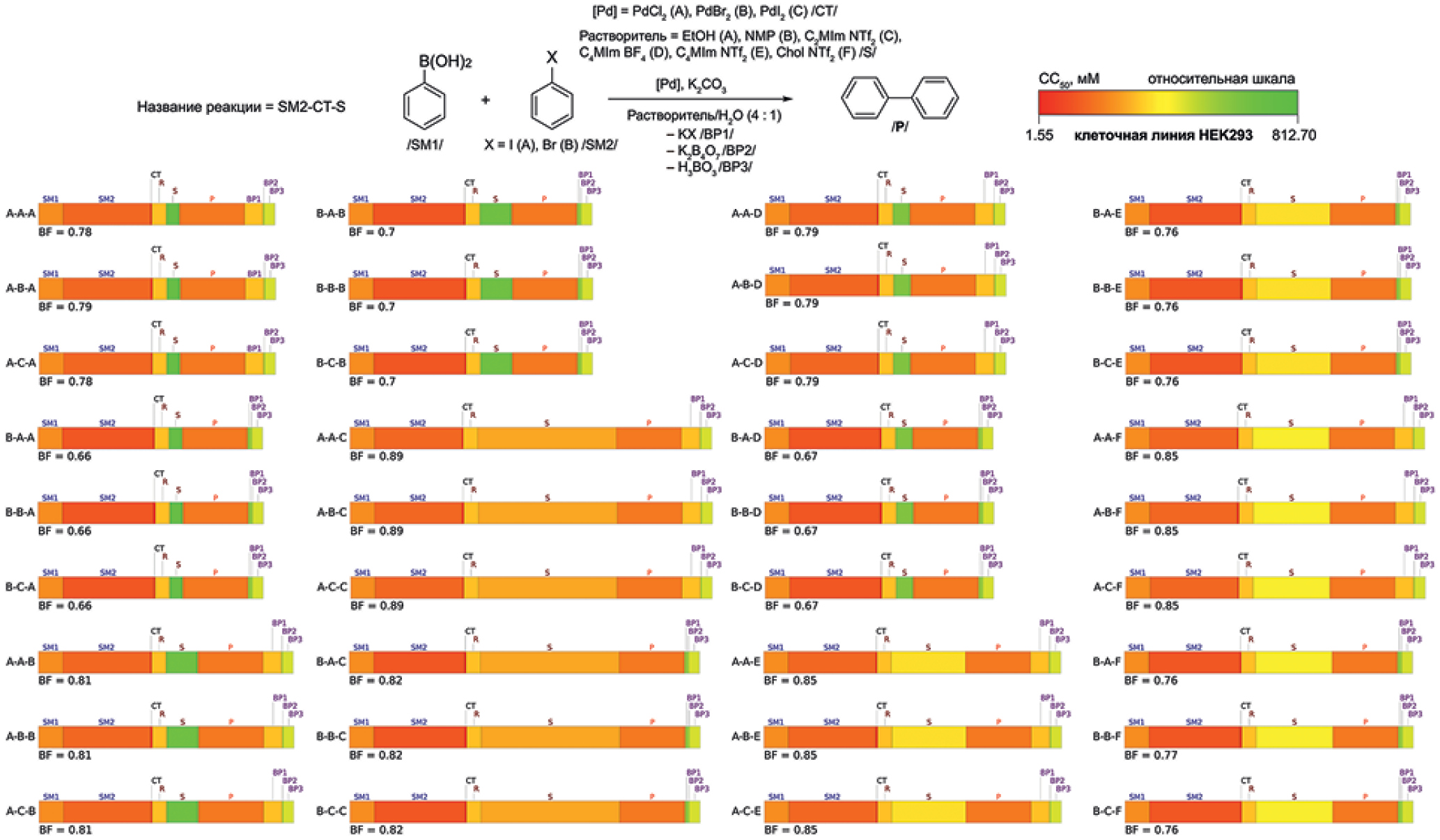 Рис. 2. Биострипы 36 способов синтеза 1,1′-бифенила (на основании данных по цитотоксичности на клетках HEK293). Первая, вторая и третья буквы в названиях реакций показывают тип исходного вещества 2 (SM2: йодбензол (A), бромбензол (B)), катализатора (CT: PdCl2 (A), PdBr2 (B), PdI2 (C)) и растворителя (S: этанол (A), NMP (B), C2MIm NTf2 (C), C4MIm BF4 (D), C4MIm NTf2 (E), Chol NTf2 (F)) соответственно.