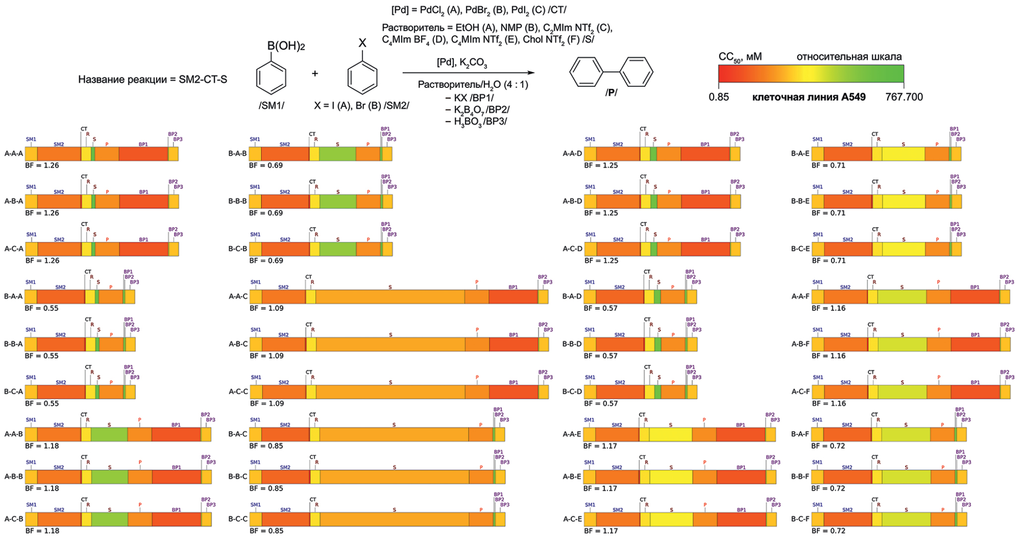 Биострипы 36 способов синтеза 1,1′-бифенила показаны на рис. 2 (данные на клетках HEK293) и рис. 3 (данные на клетках A549). Первая, вторая и третья буквы в названиях реакций обозначают тип исходного вещества 2 (SM2: йодбензол (A), бромбензол (B)), катализатора (CT: PdCl2 (A), PdBr2 (B), PdI2 (C)) и растворителя (S: этанол (A), NMP (B), C2MIm NTf2 (C), C4MIm BF4 (D), C4MIm NTf2 (E), Chol NTf2 (F)) соответственно. Значения CC50, использованные для анализа, взяты из [19].