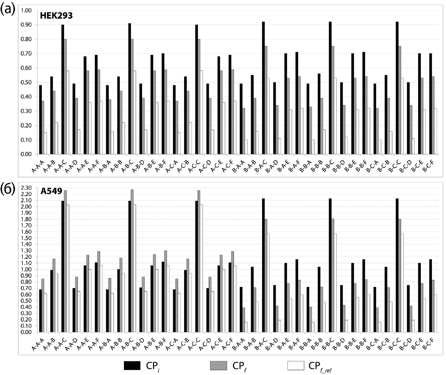 Потенциалы цитотоксичности (CP) позволяют более детально проанализировать вклад каждого компонента в “общую цитотоксичность” реакции. На рис. 4 в виде столбчатых диаграмм показаны исходные (черный цвет), конечные (серый цвет) и относительные конечные (белый цвет) CP для рассматриваемых реакций. Рисунок 4а соответствует данным, полученным на клеточной линии HEK293, а рис. 4б – данным, полученным на клеточной линии A549. Точные значения приведены в табл. 1.