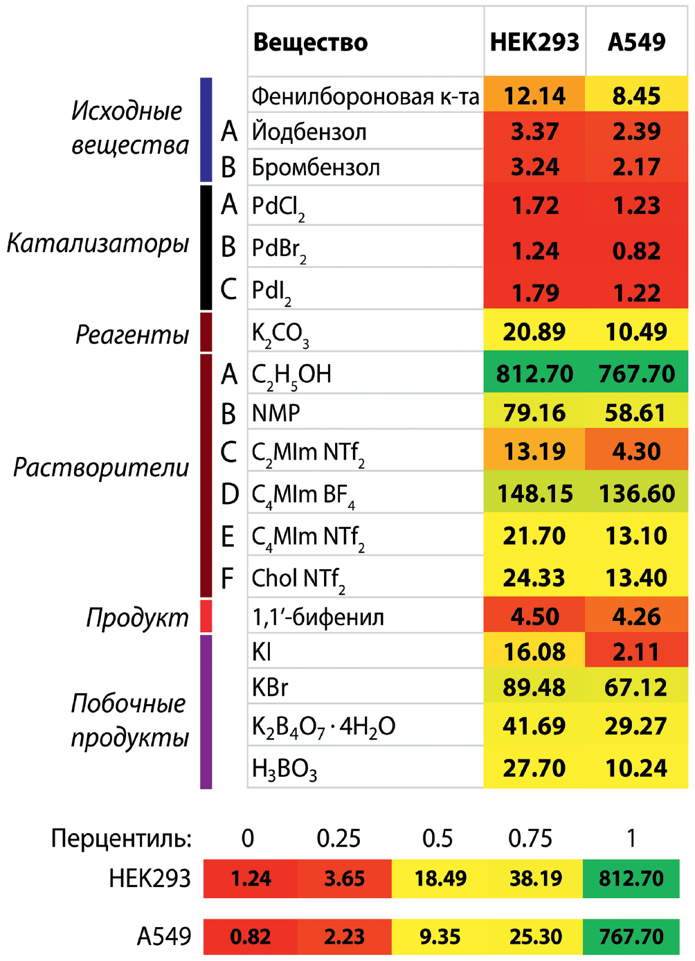 Последние рассуждения наводят на мысль о важности выбора клеточной линии, на которой получены данные для построения биострипов реакций. На рис. 5 приведено сравнение зна- чений CC50 всех компонентов изученных реакций, полученных на клеточных линиях HEK293 и A549. Хотя клетки A549 более чувствительны к токсическому воздействию, чем HEK293, в целом для исследованных веществ характерны схожие последовательности, если не точные значения цитотоксичности на этих клеточных линиях. Так, наибольшую цитотоксичность проявляют используемые в качестве катализаторов соединения палладия (PdCl2, PdBr2, PdI2), а наименьшую цитотоксичность – растворители этанол и C4MIm BF4. Исходные вещества (фенилбороновая кислота, йодбензол и бромбензол) и целевой продукт также демонстрируют достаточно высокую цитотоксичность, в то время как цитотоксичность побочных продуктов (за исключением KI) существенно ниже.