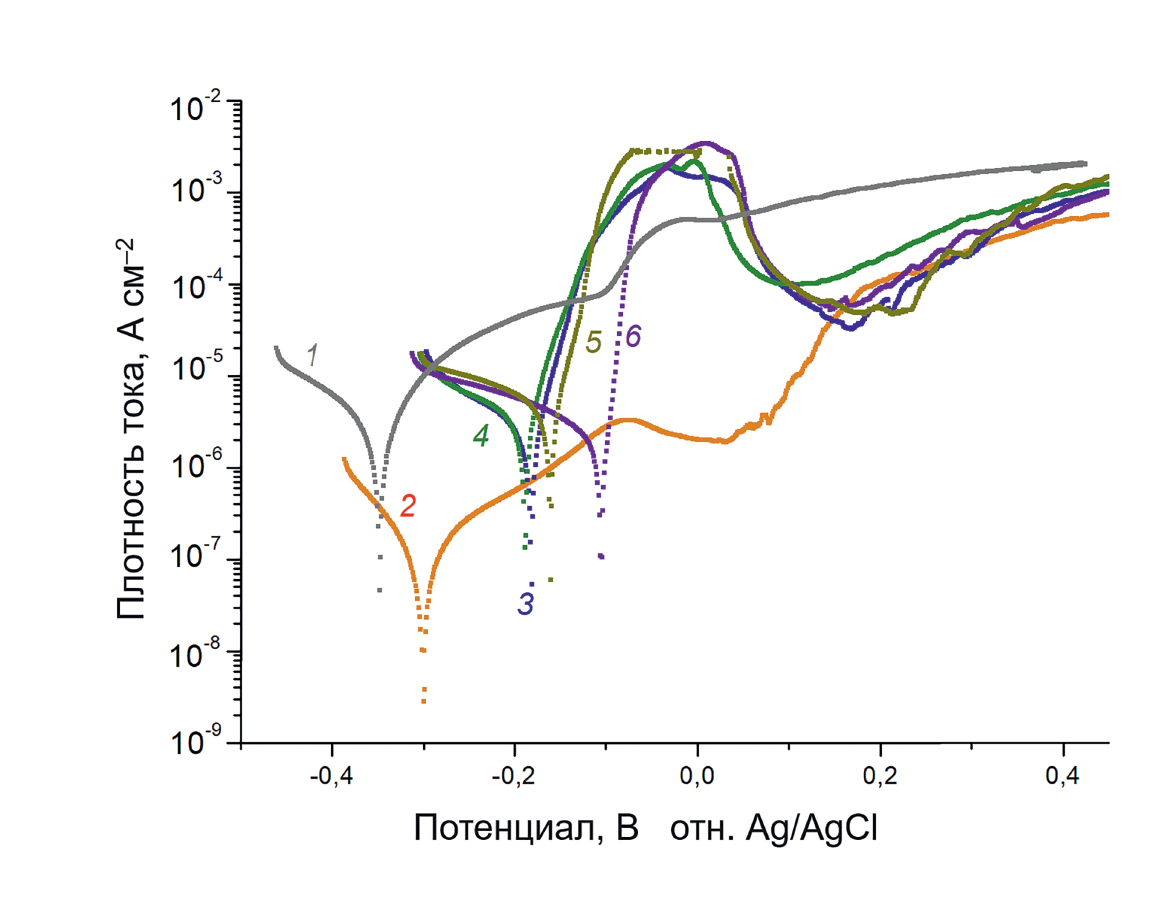 Потенциодинамические поляризационные кривые в растворе Рингера фиксировали с помощью потенциостата PGSTAT 302N (Metrohm AG, Швейцария) при скорости развертки 1 мВ с–1. Электрод сравнения – ХСЭ, вспомогательный электрод – платиновая проволока.
