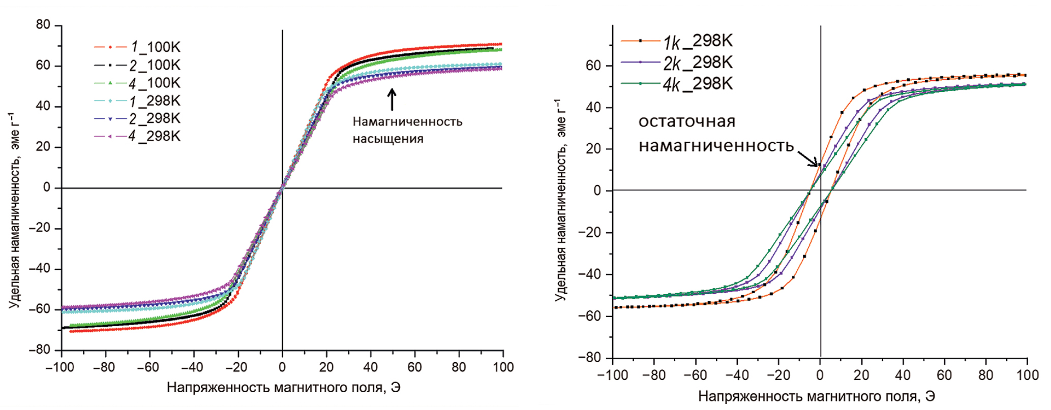 Наличие наноструктур на поверхности не сильно изменяют значение намагниченности насыщения и остаточной намагниченности, что проиллюстрировано на рис. 3а,б.