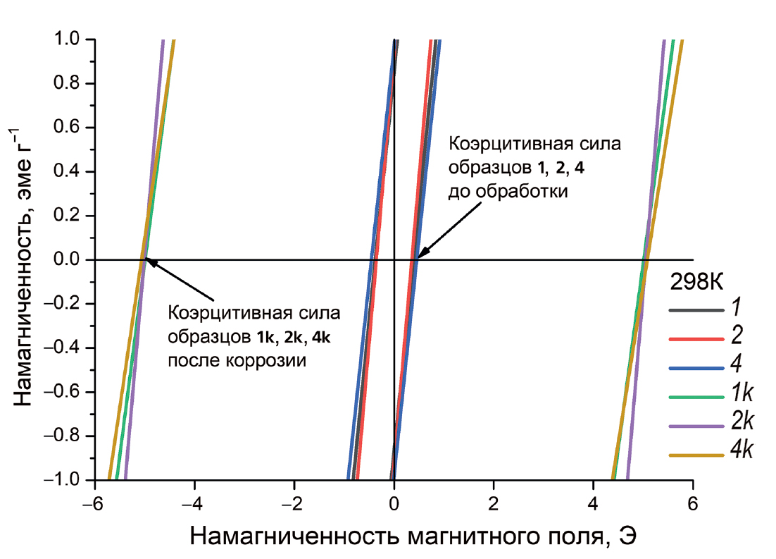 Таблица 4. Значения коэрцитивной силы, полученные для исходных образцов и после коррозионного воздействия при комнатной температуре (T = 298 K) и T = 100 K