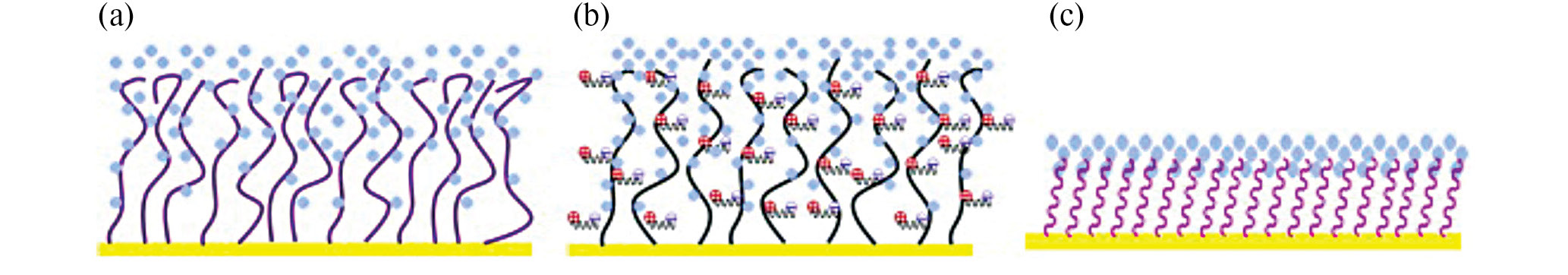 Один из способов модификации электродов цвиттер-ионами – введение их в состав тиолированных самособирающихся слоев, в качестве которых могут выступать, например, тиолированные производные бетаина [33, 34] или более сложные композиции, состоящие из нескольких тиолированных производных. Так, в [35] предложен импедиметрический биосенсор, золотой электрод которого модифицирован двумя тиолированными цвиттер-ионными производными – карбоксибетаином и сульфобетаином. Эффект такого способа защиты электрода получается особенно выражен за счет того, что самособирающиеся слои даже без цвиттер-ионных компонентов обладают противообрастающими свойствами благодаря прочному контакту с поверхностью электрода (рис. 1с), исключающему возможность адсорбции каких-либо других компонентов [36]. Кроме того, самособирающиеся слои, адсорбируемые на поверхности электрода тиольными связями, выполняют функцию иммобилизации биообъектов, например, биополимеров, в расположенных ортогонально к поверхности углеводородных радикалах.