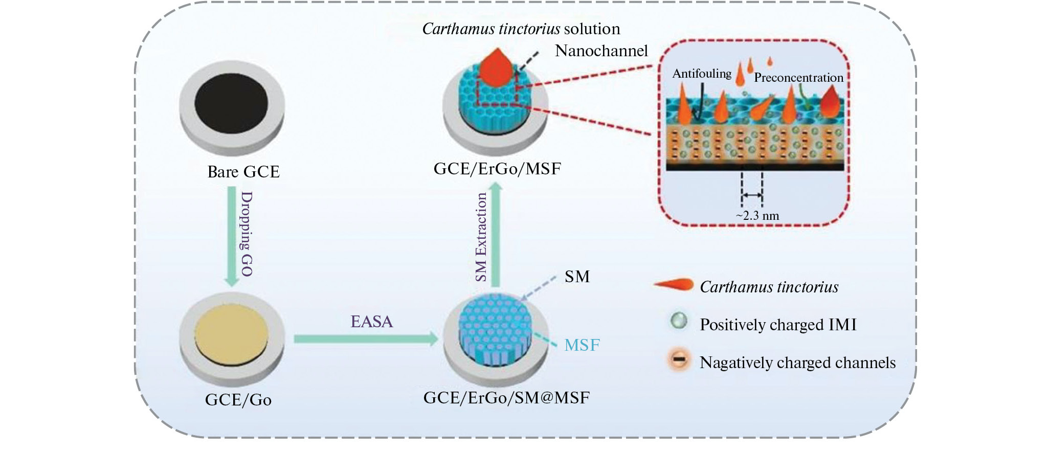 Покрытия мезопористого кремнезема могут быть выращены непосредственно на электроде методом электроассистированной самосборки (EASA, electroassisted self-assembly). Метод заключается в погружении электрода в раствор гидролизованного золя, содержащего прекурсор кремнезема (как правило, тетраэтоксисилан) и мицеллы поверхностно-активного вещества (как правило, цетилтриметиламмоний бромида), электрогенерации гидроксид-ионов на поверхности электрода c целью катализа процесса поликонденсации прекурсора, самосборке трубок кремнезема вокруг мицеллы поверхностно-активного вещества и вытравливании мицеллы с получением гексагонально упакованных одномерных трубок, расположенный перпендикулярно опоре [45–47]. На рис. 2 представлен один из способов модификации стеклоуглеродного электрода мезопористым кремнеземом с целью предотвращения обрастания, включающий этап модификации электрода оксидом графена в качестве проводящего адгезионного слоя, рост на поверхности GO пленки мезопористого кремнезема вокруг мицеллы поверхностно-активного вещества методом EASA in situ и вытравливание мицелл с помощью смеси HCl и этанола.