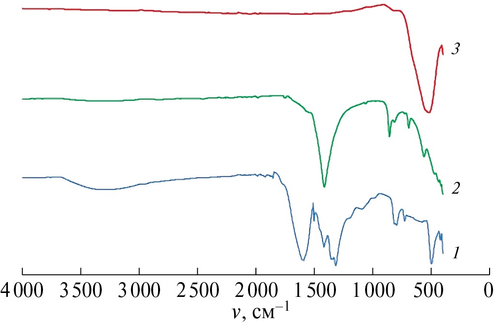ИК-спектр геля, отобранного перед возгоранием (рис. 3, спектр 1), содержит широкую полосу поглощения с максимумом при 3314 см–1, отвечающую валентным колебаниям OH-групп, и интенсивную полосу поглощения при 1590 см–1, соответствующую валентным колебаниям C=C связи [13]. Полоса при 1417 см–1 соответствует асимметричным валентным колебаниям C–O-связи [14], а при 1200 и 1084 см–1 – колебаниям группы C–O–C [15]. Наличие в спектре асимметричных и симметричных валентных колебаний связи N=O при 1503 и 1315 см–1 [16], наряду с валентными колебаниями связи N–O при 1360 см–1 [17], свидетельствует о присутствии в геле анионов NO3– . В низкочастотной области спектра присутствует ряд полос, обусловленных связями Mo–O: 997 см–1 (Mo=O) [18], 796 и 421см–1 (MoO42–) [19], 726 см–1 (Mo–O) [18], 576 и 497 см–1 (Mo–O–Mo) [18].