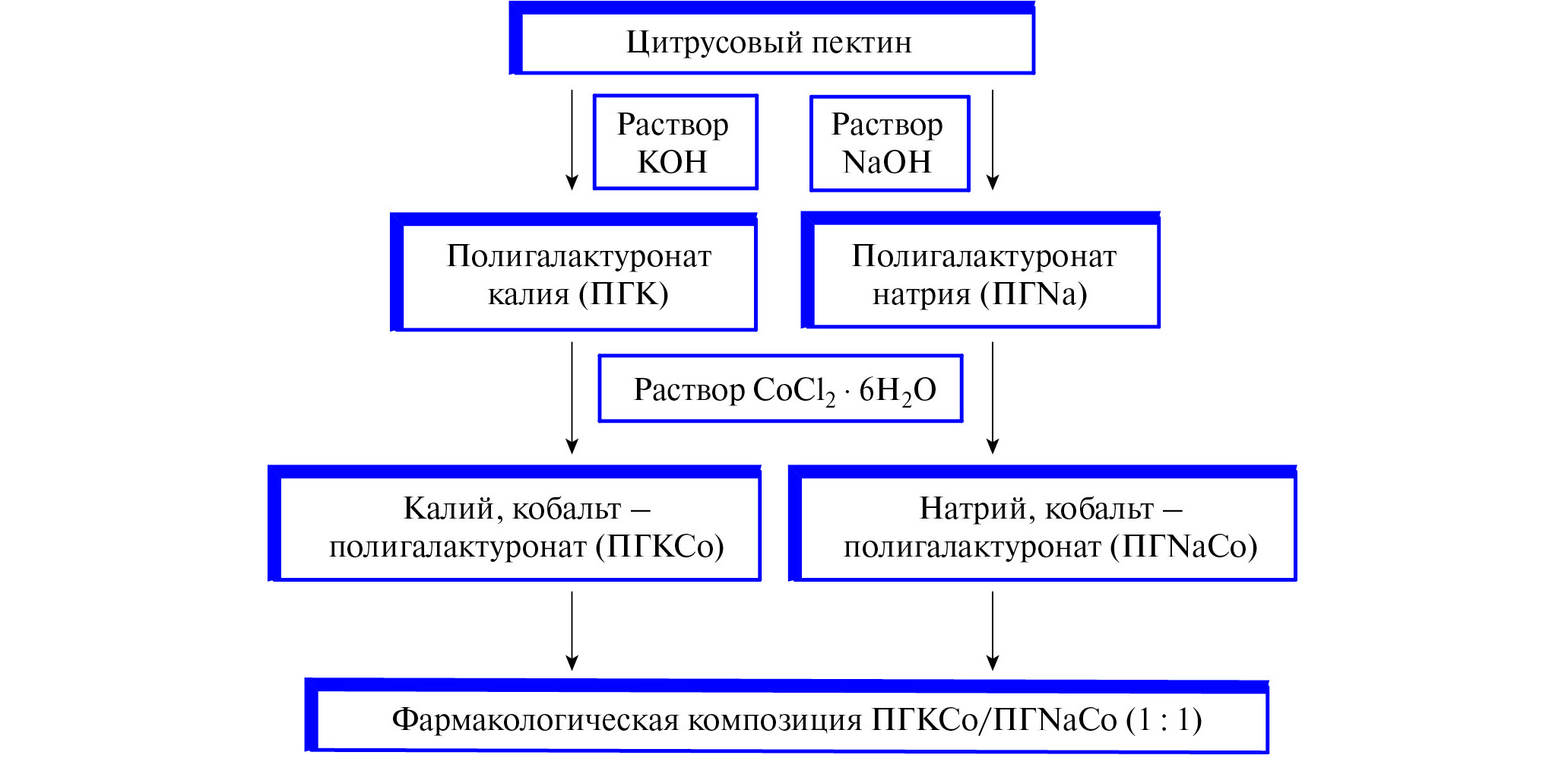 На основе растительного полисахарида полиуронидной природы, а именно цитрусового пектина, обладающего широким спектром биологической активности, получены водорастворимые металлокомплексы ПГKCo и ПГNaCo, исследованы их элементный состав и физико-химические свойства. На основе разработанного в данном исследовании способа получения водорастворимого ПГKCo и синтезированного нами ранее ПГNaCo впервые получена фармакологическая композиция ПГKCo/ПГNaCo (1 : 1).