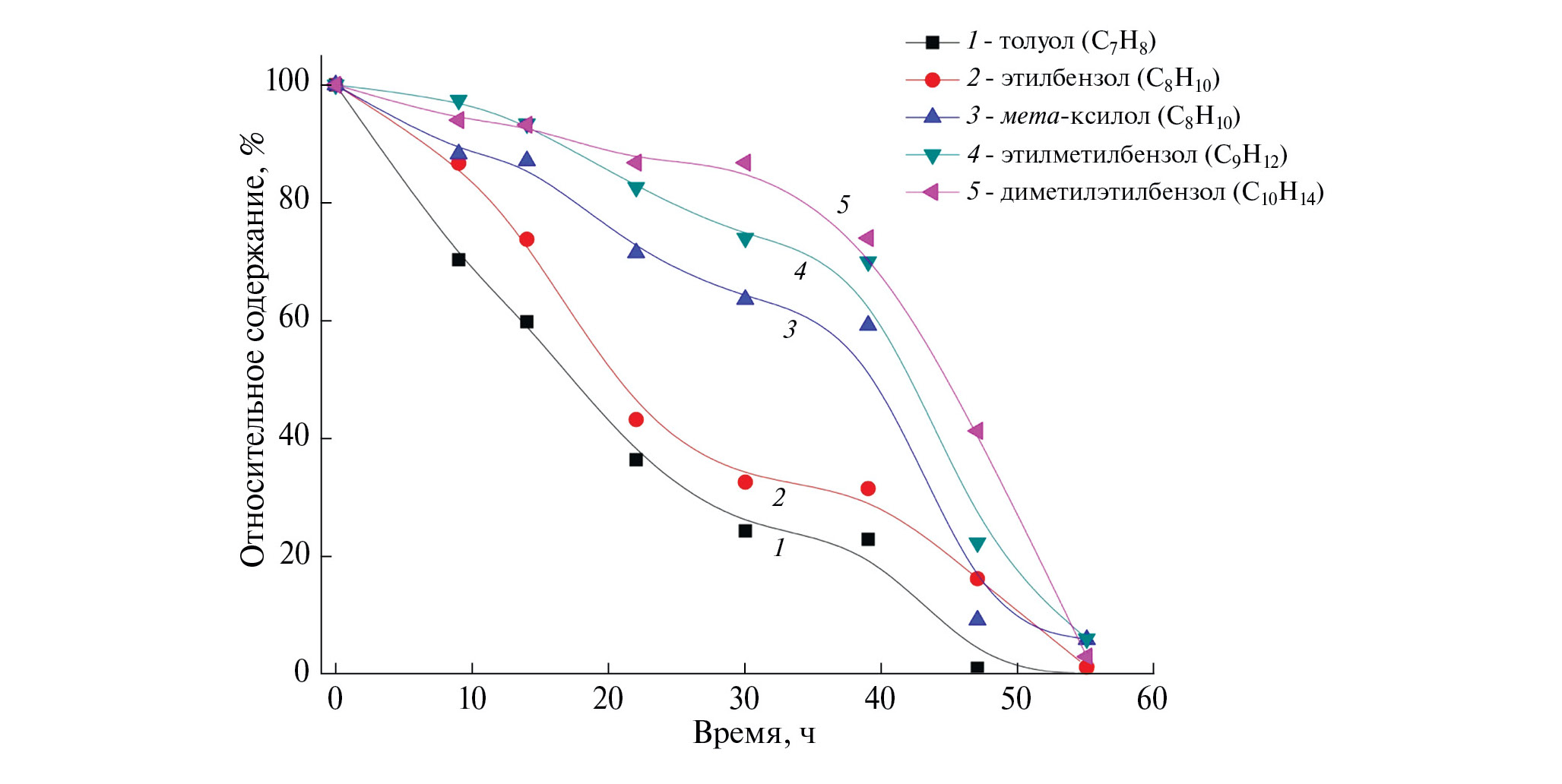 Поскольку гидрирование многокомпонентной модельной смеси ароматических углеводородов проводили при разных режимах (Р, Т), то напрямую оценить вклад условий реакции в изменение скорости реакции довольно сложно. При этом, первичное сравнение данных табл. 3 указывает на низкую активность используемого триметаллического катализатора при гидрировании данных соединений. С другой стороны, это позволяет более детально изучить изменение состава гидрируемой смеси, что не всегда возможно при быстро протекающей реакции. В частности, на рис. 1 приведены графики изменения относительного содержания наиболее типичных из исследуемых ароматических углеводородов в зависимости от времени гидрирования.