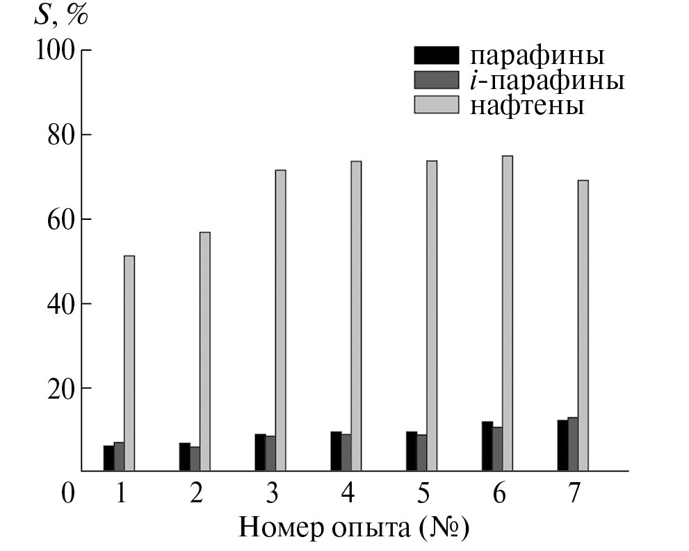 Основными продуктами реакции являются нафтеновые соединения (табл. 4). Смесь содержит 10.21% парафинов, 10.83% изопарафинов, 15.31% аренов и 58.47% нафтенов, а также 5.18% неидентифицированных соединений состава С9–С12. Обобщенный групповой состав смеси после гидрирования приведен в табл. 4. Вместе с нафтеновыми соединениями, вне зависимости от используемых условий реакции, во всех проведенных экспериментах образуется достаточно большое количество парафиновых углеводородов. Причем, если общая селективность по всем образующимся нафтенам, достигнув максимума на уровне 70–75%, перестает расти при увеличении конверсии исходных ароматических соединений, то выход парафиновых углеводородов в этих же условиях демонстрирует поступательный рост (рис. 2). Линейные и изомерные парафиновые углеводороды во всех анализируемых пробах присутствуют в примерно равных количествах, а их общая доля в конечной пробе превышает 20%. По мере гидрирования симбатно со снижением плотности и октанового числа происходит повышение давления насыщенных паров и средней молекулярной массы гидрируемой смеси. При этом сравнение приведенных в табл. 3 экспериментальных данных показывает, что увеличение средней молекулярной массы происходит неравномерно. Это может указывать на наличие побочных реакций деструкции гидрируемых молекул.
