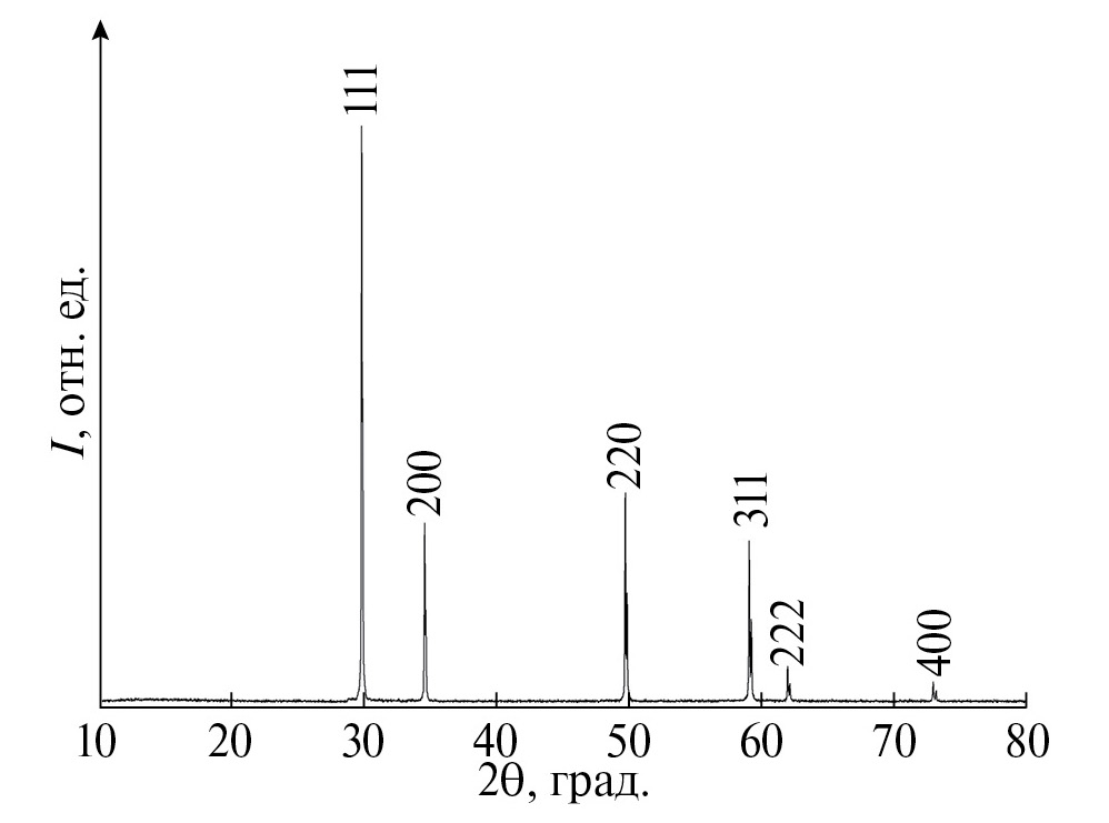 Рис. 1. Дифрактограмма образца твердого раствора Tm2O3‧2HfO2, структурный тип Fm3m, а = 5.170(7) Å, CuKα-излучение, λ = 1.5418 Å.