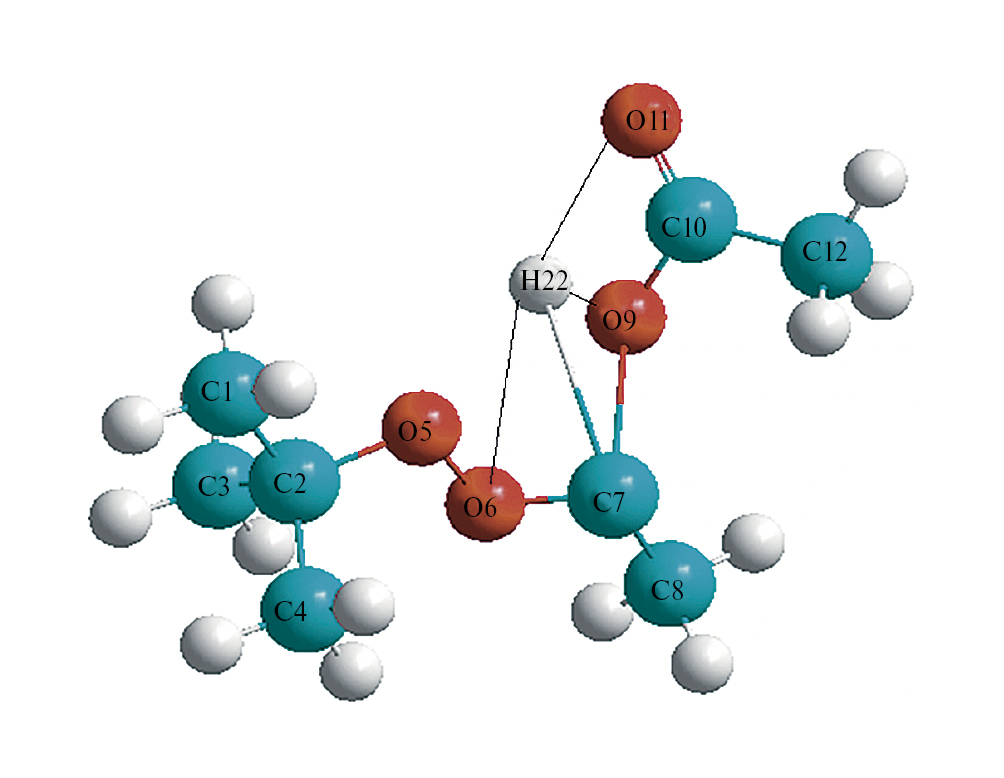Квантово-химический анализ структур ТБПЭ показал, что их свободное вращение в области значений торсионного угла 90°–280° практически не затруднено, они имеют неплоскостное (объемное) строение. Ацильный фрагмент молекул как обычно располагается в одной плоскости, а остальная ее часть находится почти в ортогональном положении к этой плоскости (рис. 1), что подтверждается величиной валентного угла O6–C7–H22 (105.7° ± 0.5°). Величина диэдрального угла C2–O5–O6– C7, составляющая 175.5°, является следствием специфических нековалентных взаимодействий, так как в их отсутствии этот угол практически для всех пероксидов находится в интервале 110° ± 25° [4]. Именно эта особенность отражается на положении атома водорода H22 у третичного атома углерода C7, который оказался равноудаленным от кислорода пероксидной группы О6 на 2.05 ± 0.01 Å и эфирного О9 на 2.06 ± 0.001 Å, но не карбонильного О11 (2.38 ± 0.05 Å) (рис. 1).