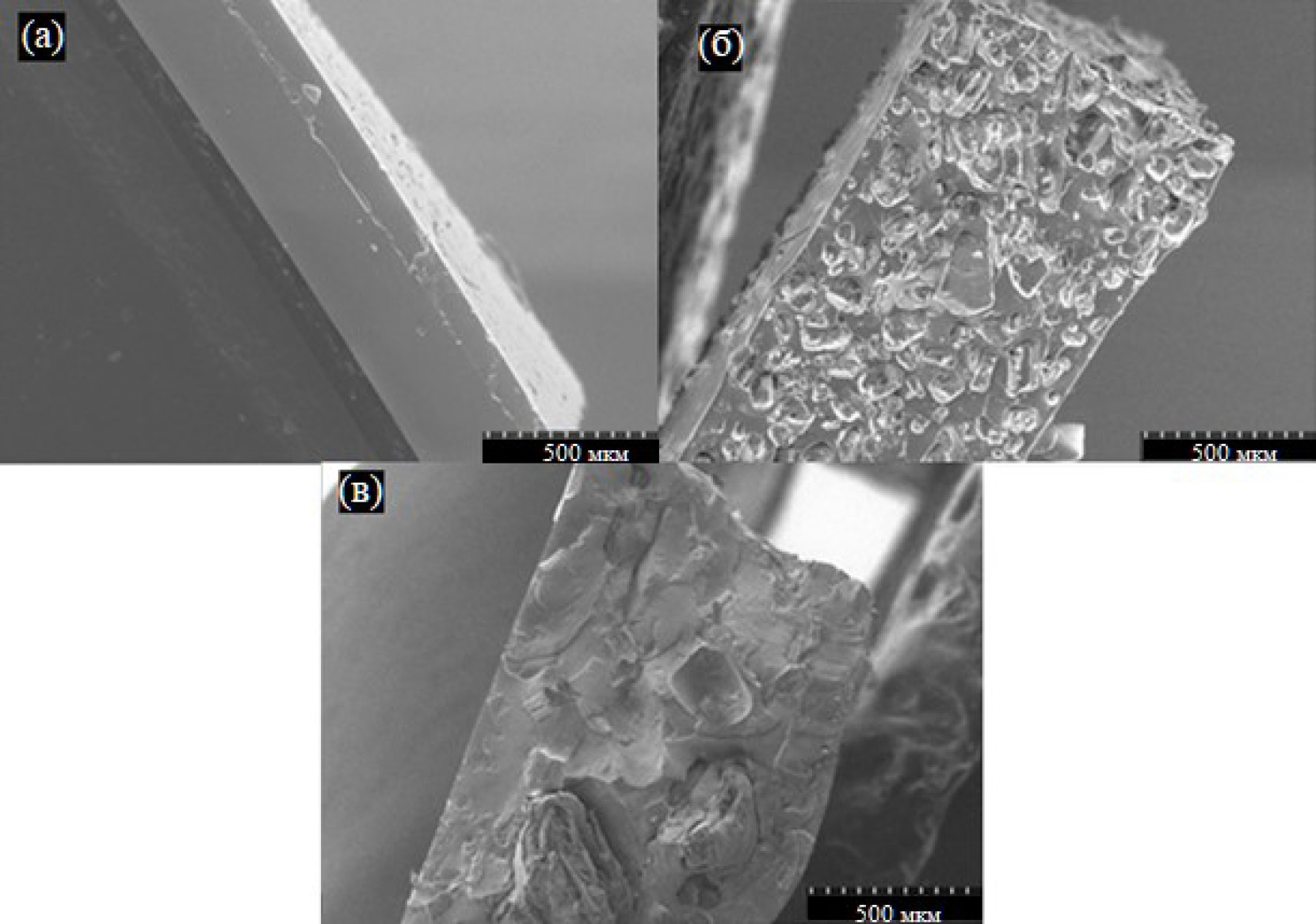 Рис. 1. Изображение СЭМ среза пленок полисилоксана: без использования наполнителей [24] (а), изготовленных с использованием гидрокарбоната натрия (б) [24], изготовленных с использованием хитозана (в).