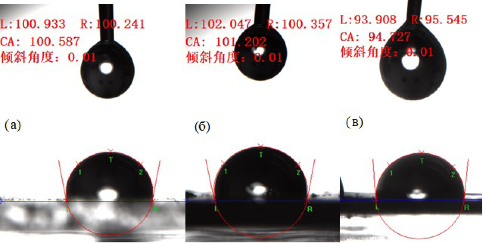 Рис. 2. Определение краевого угла смачивания пленок полисилоксана: без наполнителя (а), изготовленных с использованием гидрокарбоната натрия (б), изготовленных с использованием хитозана (в).