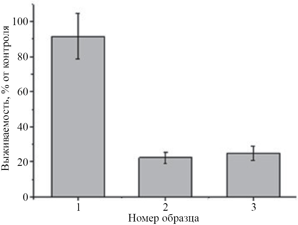 Рис. 3. Метаболическая активность клеток NCTC L929 по результатам МТТ-теста при инкубации в течение 24 ч с 3-суточными вытяжками из пленок полисилоксана: изготовленных с использованием хитозана (образец 1) без использования наполнителей (образец 2), изготовленных с использованием гидрокарбоната натрия (образец 3).
