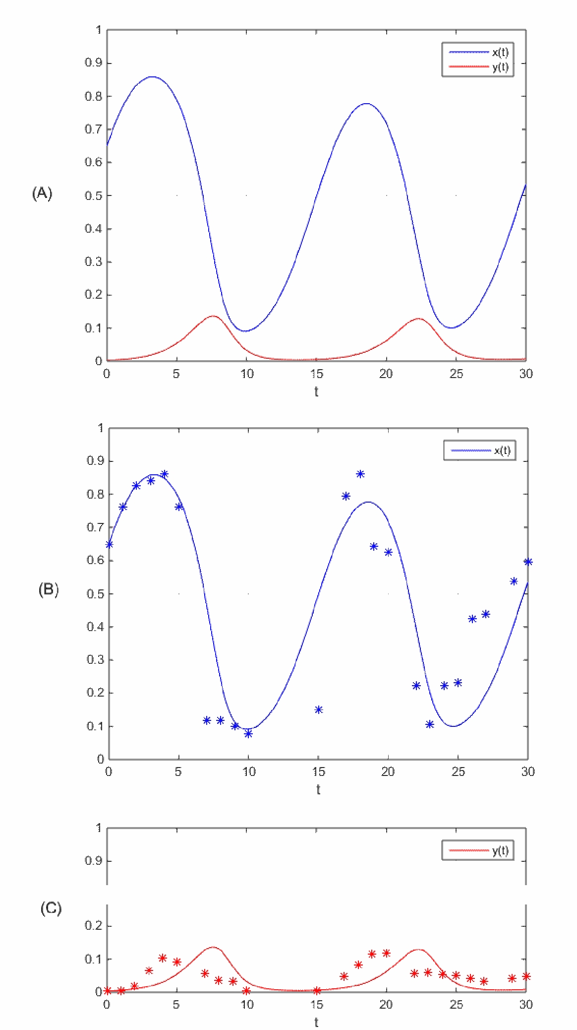 Рис. 1. Динамика компонент системы (1.1) при идентифицированных значениях параметров (A). Сравнение восстановленной динамики компонент x(t) (B) и y(t) (C) системы (1.1) с соответствующими экспериментальными данными (отмечены символами "*")