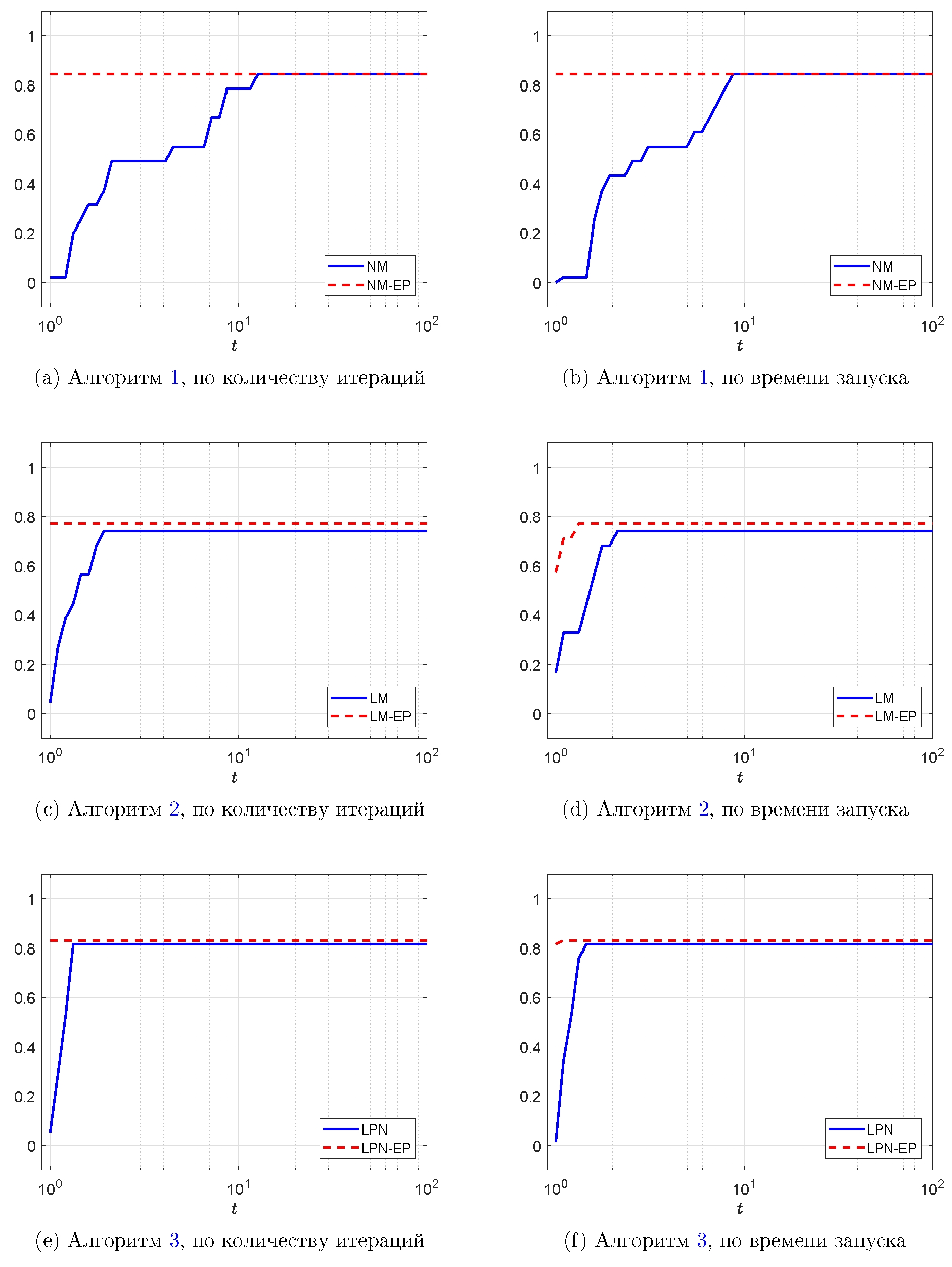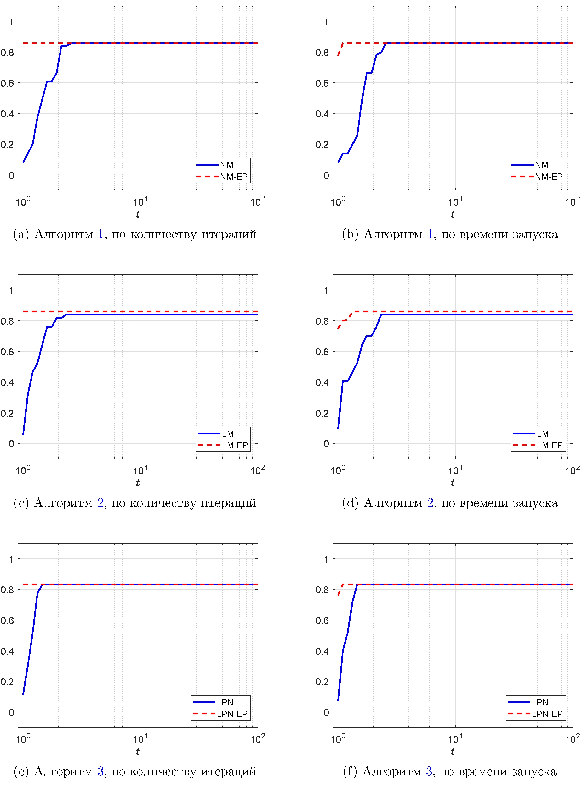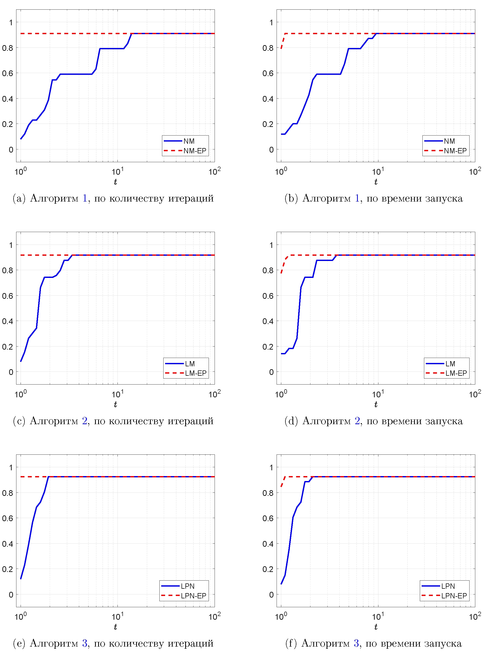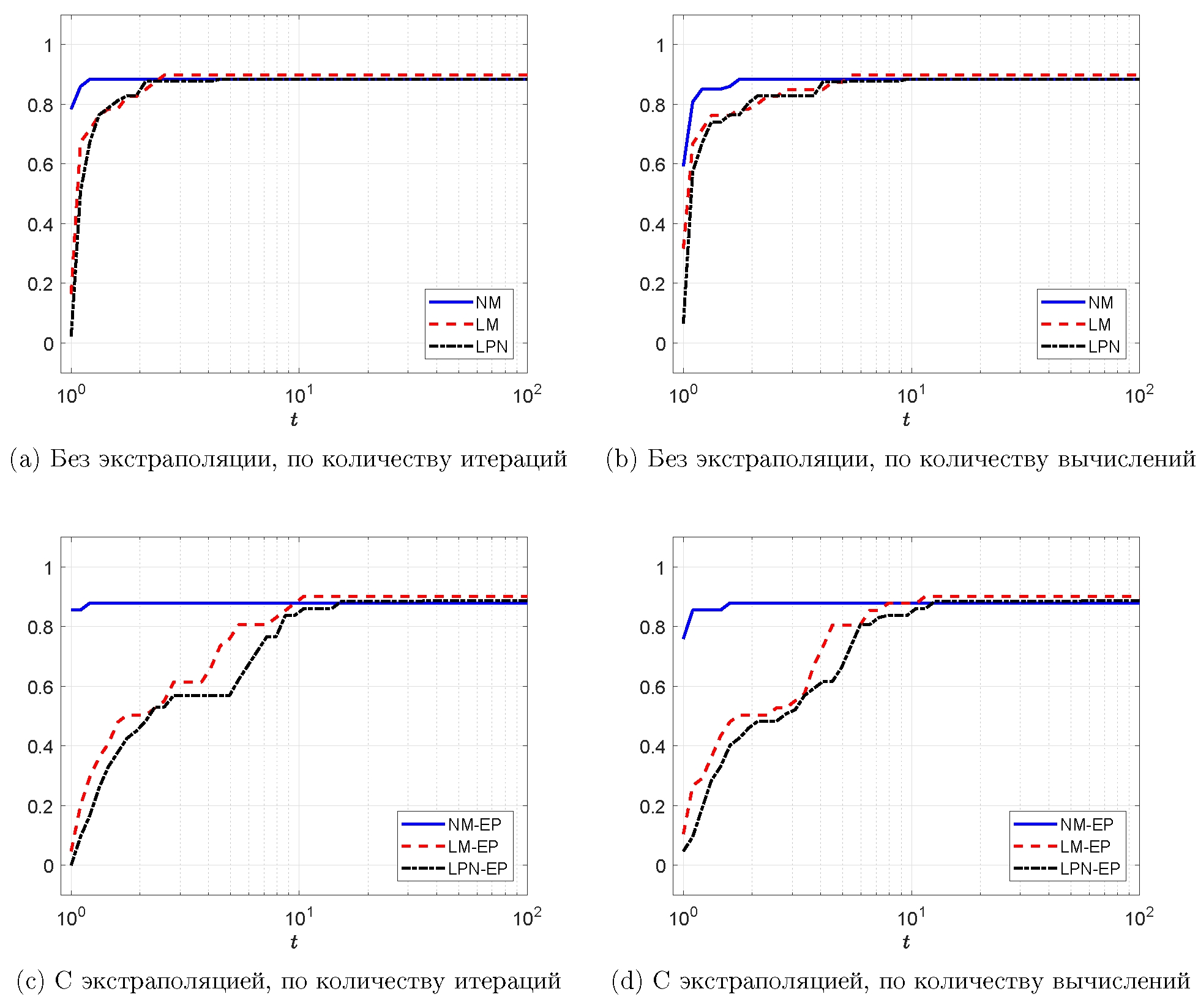 Интересное наблюдение состоит в том, что по времени алгоритм 2 показывает лучший результат на примерно 70% задач (по указанным выше причинам эти результаты здесь не приводятся), а по количеству вычислений Φ и особенно по количеству итераций такой процент гораздо ниже; см. рис. 5а, 5б. Возможное объяснение состоит в том, что по средним значениям принимаемых алгоритмами параметров длины шага алгоритм 2 также оказывается лучшим на сравнимой доле задач, как и по среднему количеству последних полных шагов; см. таблицу 1.