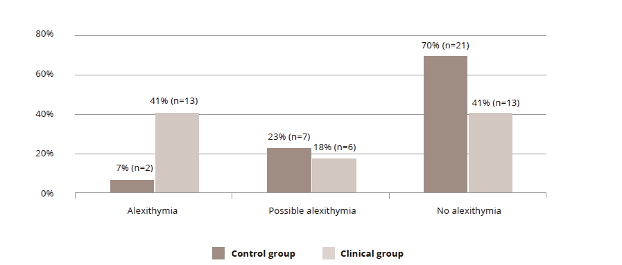 Not surprisingly, the Mann-Whitney test revealed that higher levels of alexithymia, measured by the Toronto Alexithymia Scale, were more common among the patients than the healthy participants (mean ranks 1240 and 713, respectively, W = 248.000; Z = -3.270; p = 0.001). Figure 1 demonstrates the distribution of the alexithymia levels in the two groups.