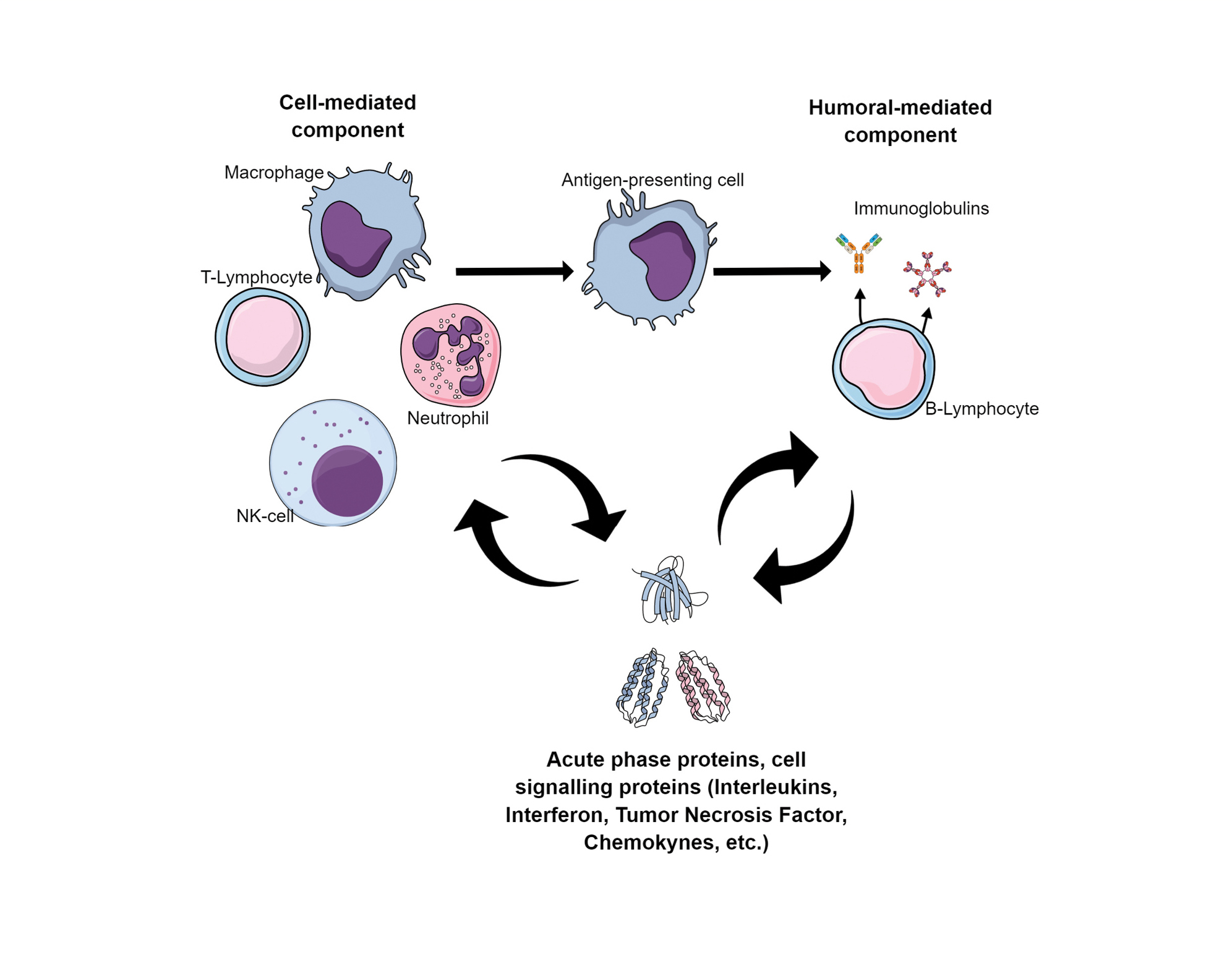 Both the innate and the adaptive immune system involve a cell-mediated (immune cells) and humoral-mediated (immunoglobulins and complement) response. The activation of innate immune cells causes inflammation and stimulates the presentation of antigens to adaptive immune cells (T-lymphocytes and B-lymphocytes). When facing an antigen, the T-lymphocytes mediate cytotoxicity against the infected or altered cells and activate B-lymphocytes to proliferate and produce immunoglobulins. The activated immune cells are orchestrated by the variety of cytokines and produce acute phase proteins.