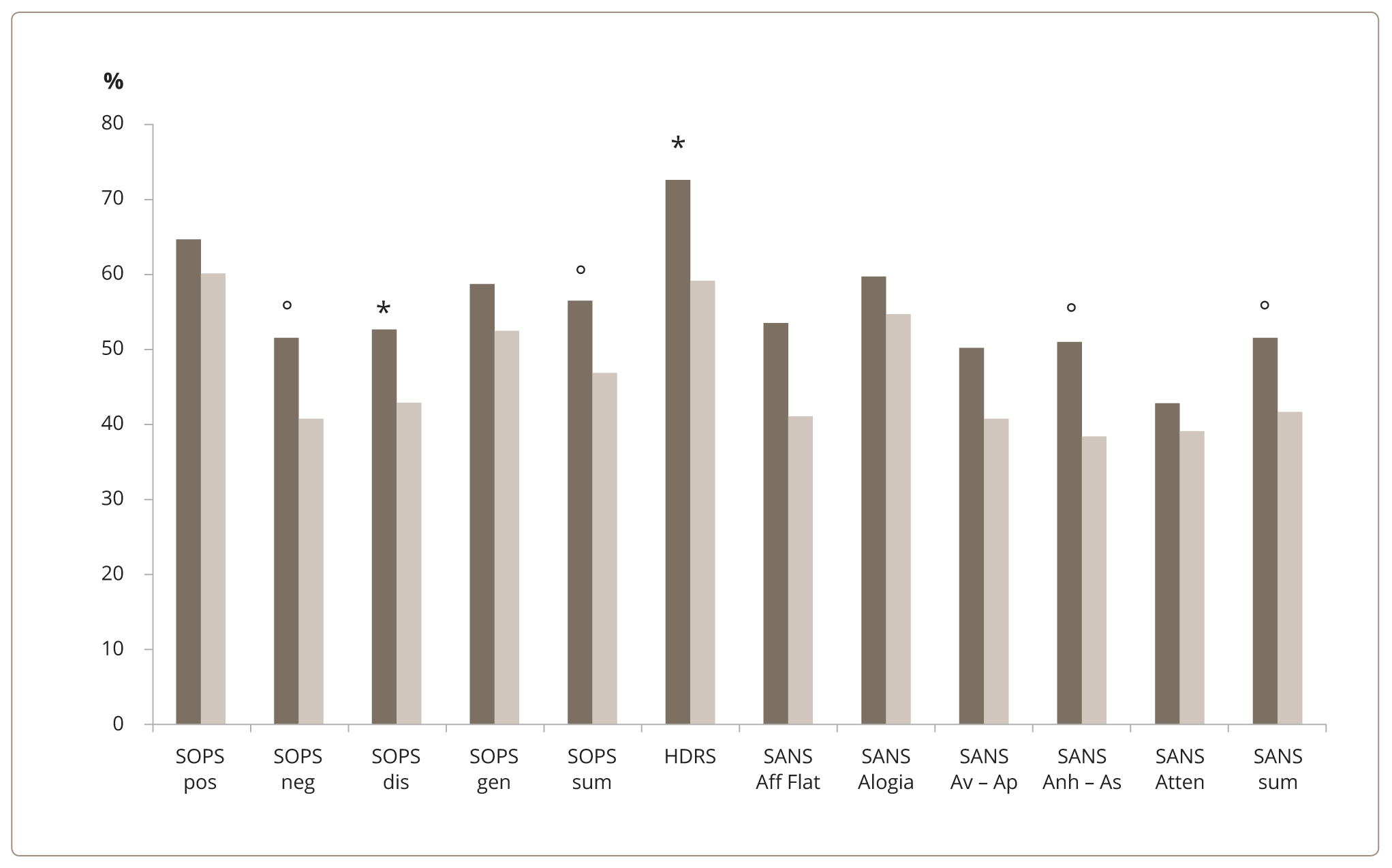 Figure 1. Degree of depressive and non-affective symptoms reduction (%) in the two groups of patients. Note: * — statistically significant (р <0.05); ° — trend towards statistical significance (0.05< р <0.1). Dark columns — the first group; light columns — the second group; pos — positive; neg — negative; dis — disorganization; gen — general; sum — summary; Aff Flat — Affective Flattening or Blunting; Av – Ap — Avolition – Apathy; Anh – As — Anhedonia – Asociality; Atten — Attention.