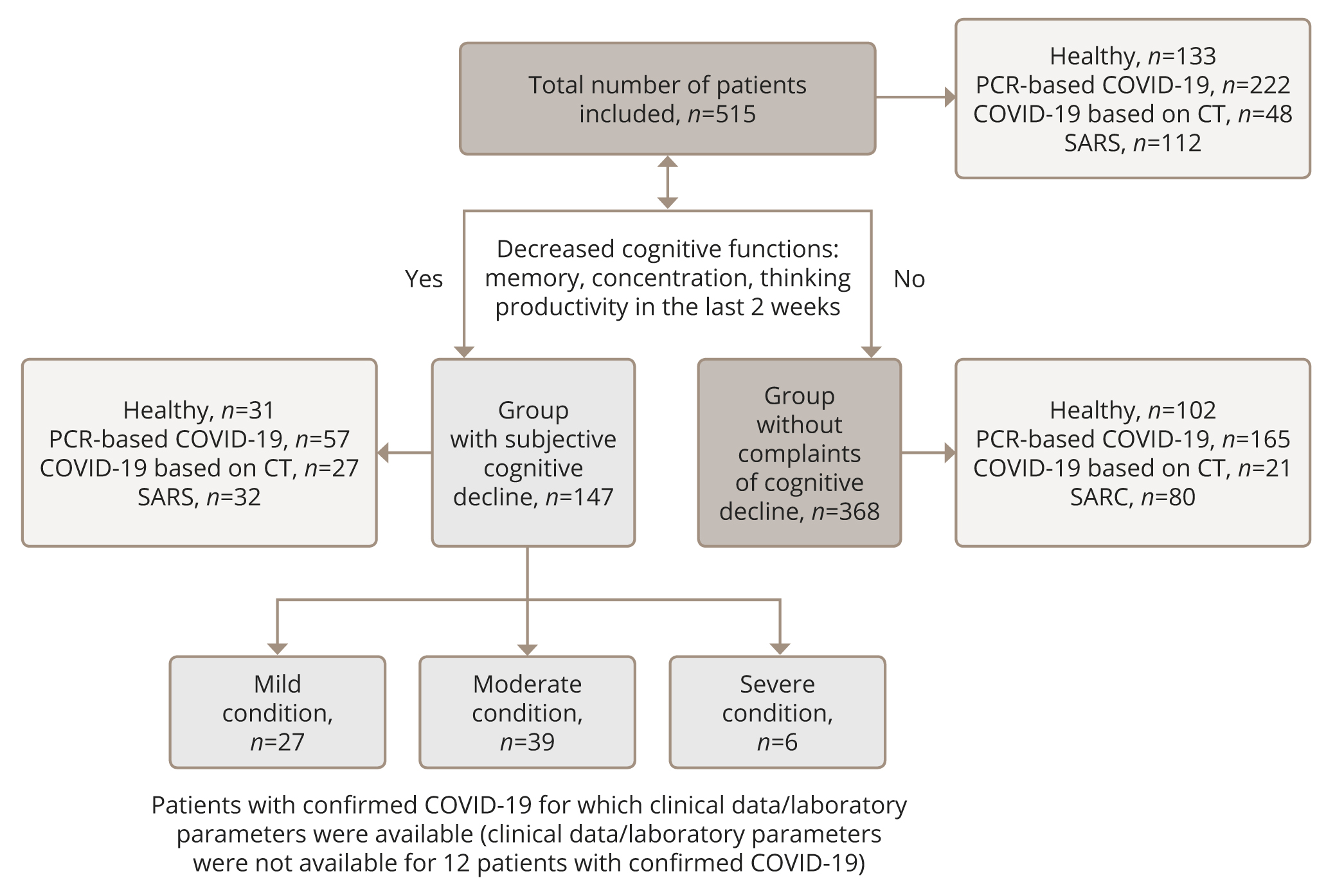 In the group of patients with subjective cognitive decline, 116 patients were diagnosed with COVID-19 or showed signs of SARS. The complete body of clinical and laboratory data required to determine the severity of the disease was available for 72 patients. Thus, a severe course of the disease was found in six people; the average condition — in 39 patients; and mild — in 27. The sample stratification is illustrated in Figure 1.
