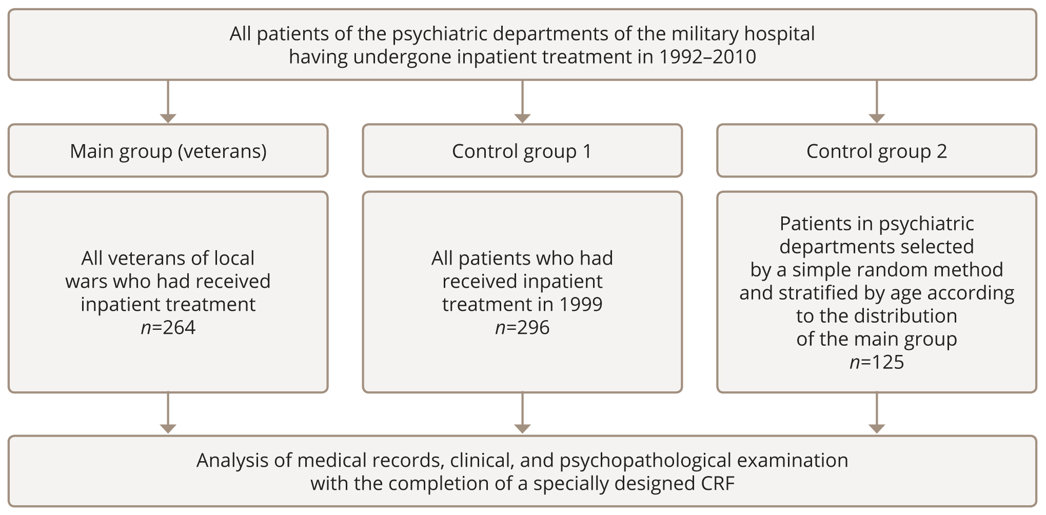 The observational case-control study included 685 servicemen and retired military personnel who had been treated in the psychiatric department of the Main Military Clinical Hospital named after. N.N. Burdenko from 1992 to 2010 (Figure 1).