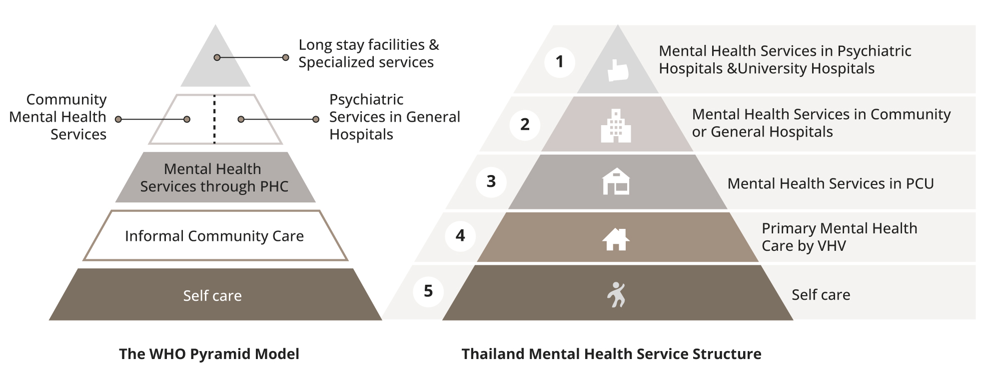 However, compared to the WHO “pyramid” model, there are no stand-alone community mental health centers available in Thailand because our country has already integrated its mental health infrastructure up to the community level (Figure 2) [1].