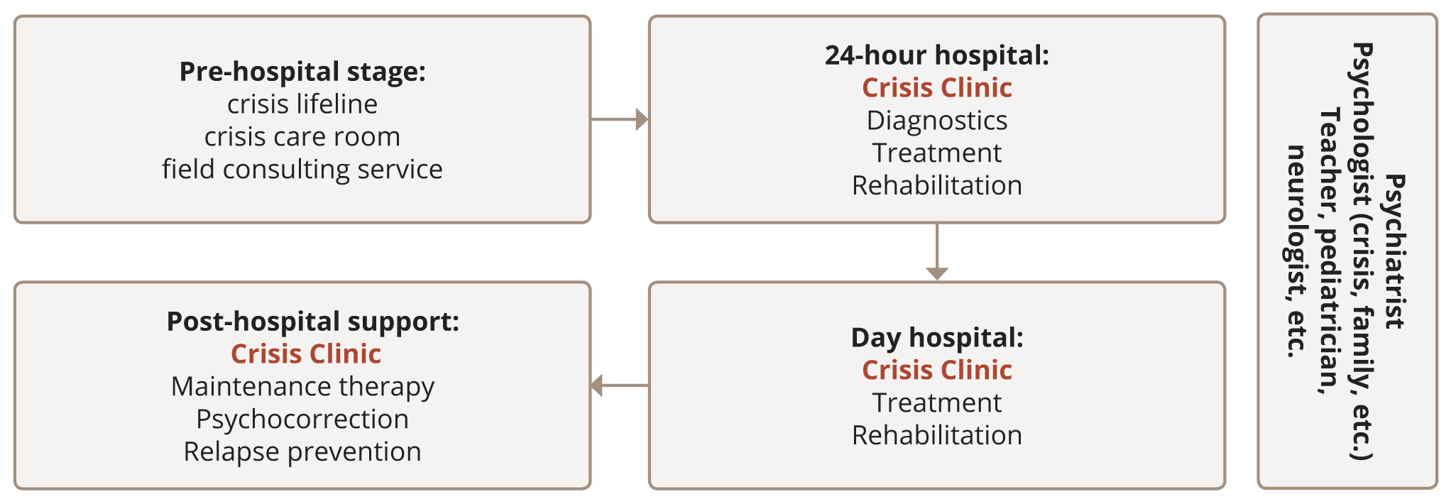 CONCLUSION: The need to remedy severe crisis conditions and their associated psychopathological repercussions (including suicidal and self-harming behavior) calls for coordinated efforts on the part of specialists from different fields of knowledge related to childhood and adolescence. Our analysis of the experience of working with children and adolescents in the Crisis Clinic at the Sukhareva Center shows that there is high demand for such highly specialized institutions and that the basic principles laid down at its creation, urgency, stage, and continuity of care, poly-professionalism with a focus on non-drug treatment methods, orientation towards the patient’s family are relevant.