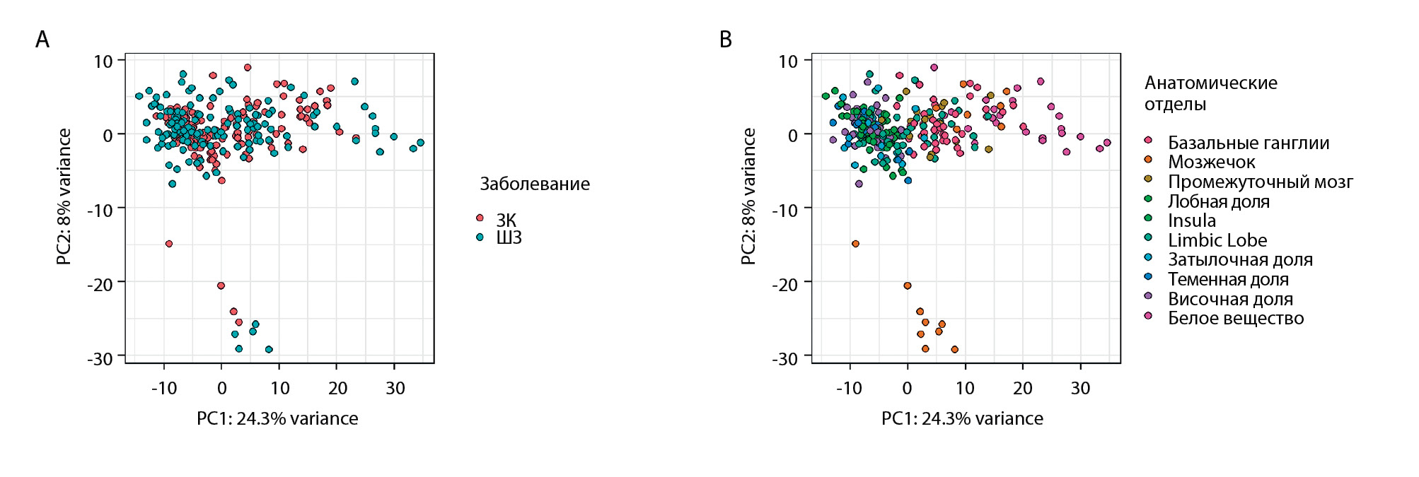 Previously, we published transcriptome data covering 33 regions of a healthy human brain [28]. Here, we analyzed gene expression in the same 33 regions in four individuals diagnosed with SZ, and two additional brain regions, temporopolar cortex (BA38) and secondary auditory anterior cortex (BA21a), in the diagnosed and control groups (Figure 1, Table S1 in the Supplementary). Based on these data, we detected the expression of 861 annotated human lincRNAs that passed the intensity threshold. Visualization of expression variation using the principal component analysis (PCA) showed substantial overlap of HC and SZ samples (Figure 2A), while the segregation of the samples with regard to anatomical regions was more evident (Figure 2B).