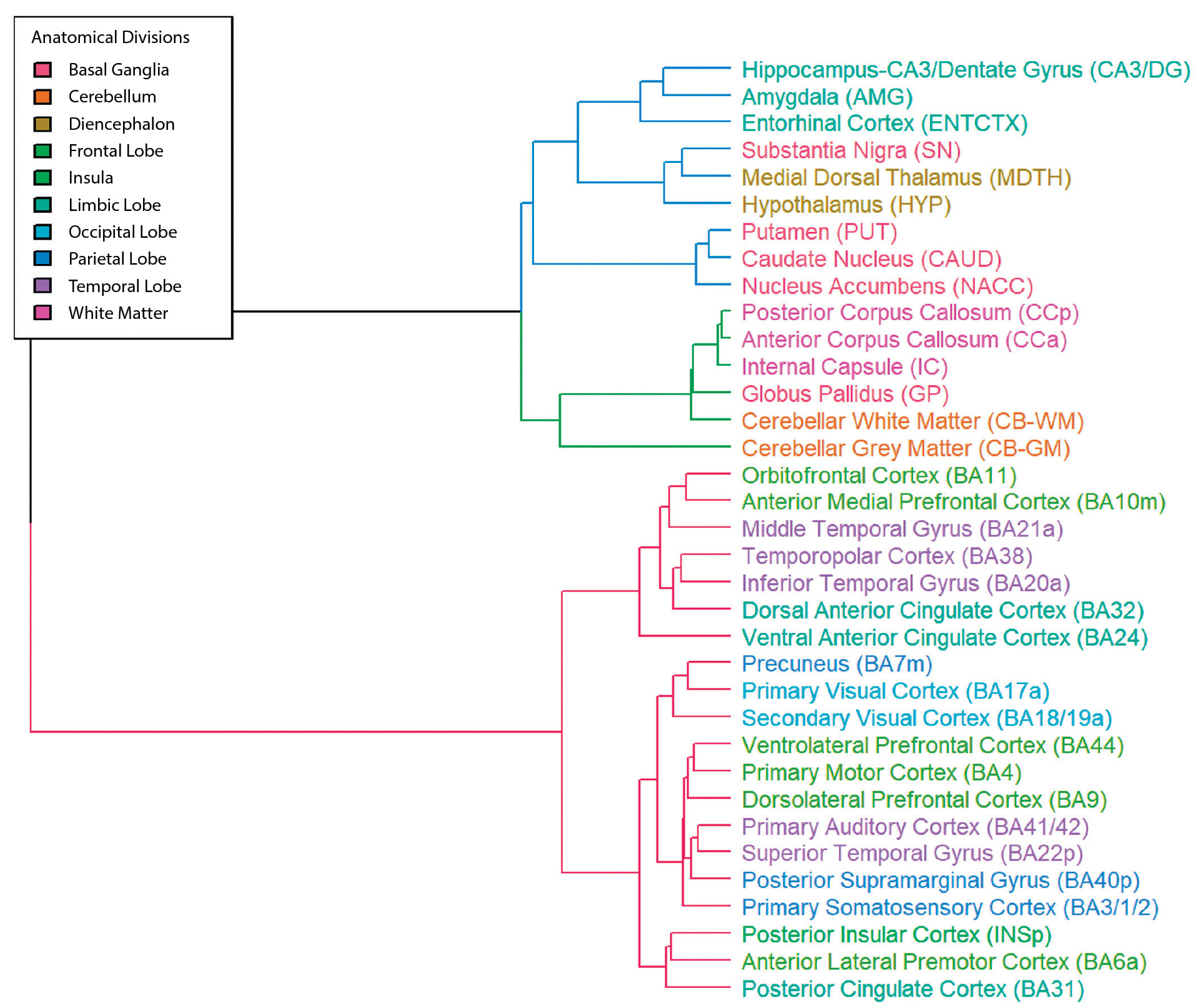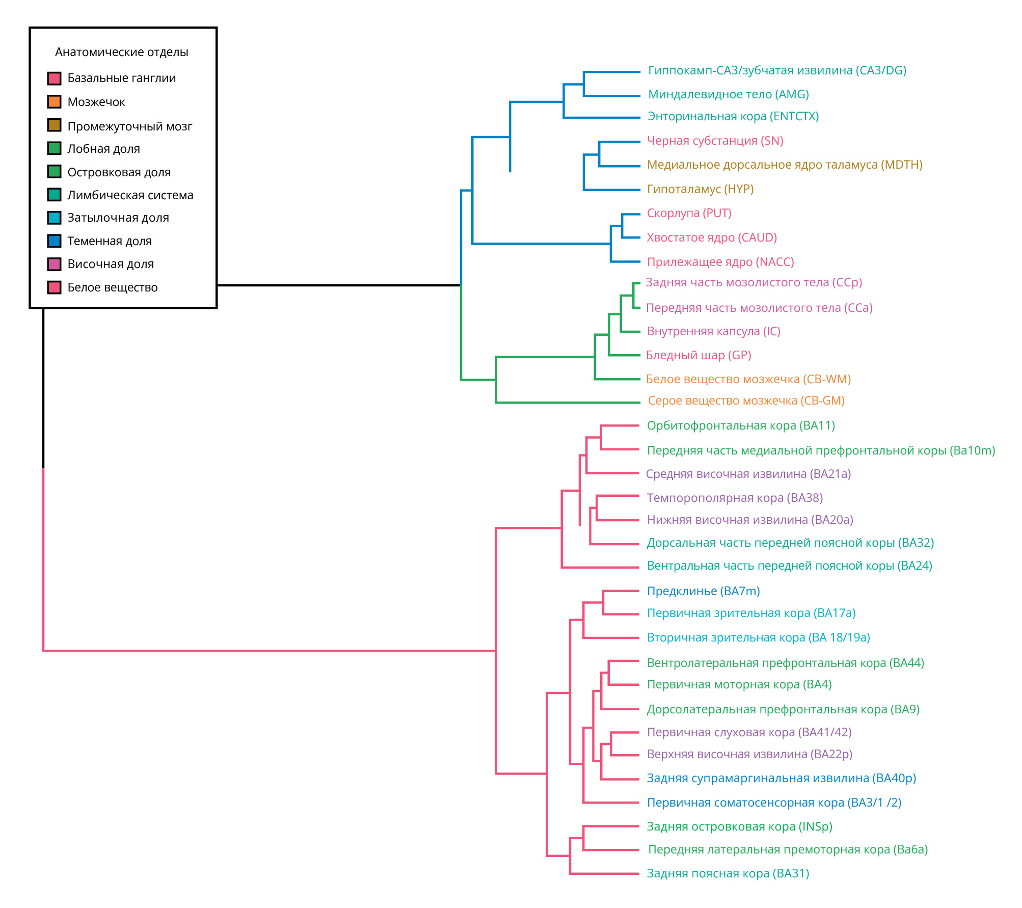 Aligning with the PCA results, we identified three clusters of brain regions produced by unsupervised hierarchical clustering based on lincRNA expression levels, aligning with the anatomical subdivision of the brain (Figure 3, Figure S1 in the Supplementary). The first cluster contains mainly the neocortical areas; the second — all the connective nerve tracts and the cerebellum; and the third — the diencephalon and most of the basal ganglia. Substructures of the limbic system belong to both clusters I and III, with the regions spatially related within the clusters.