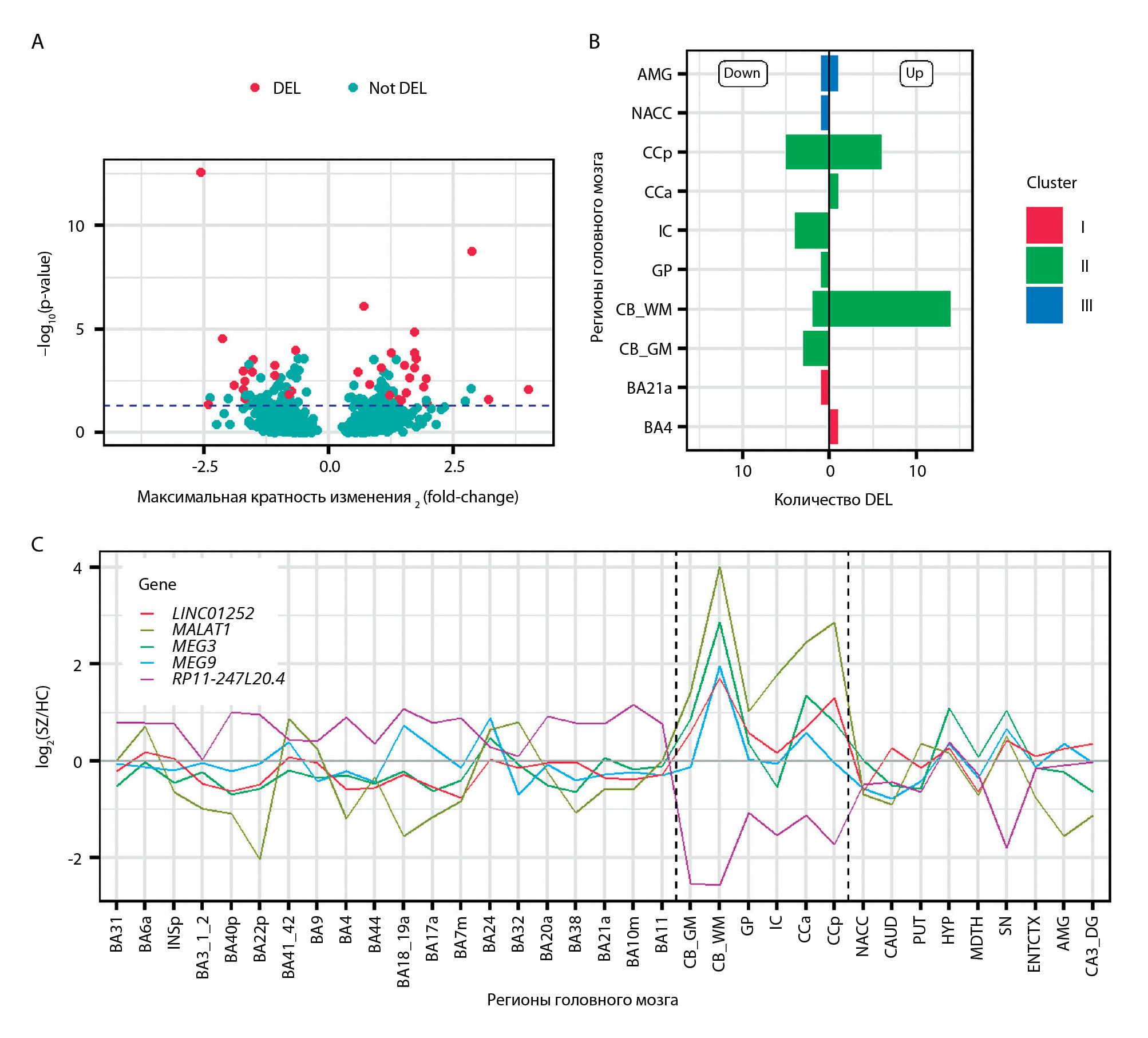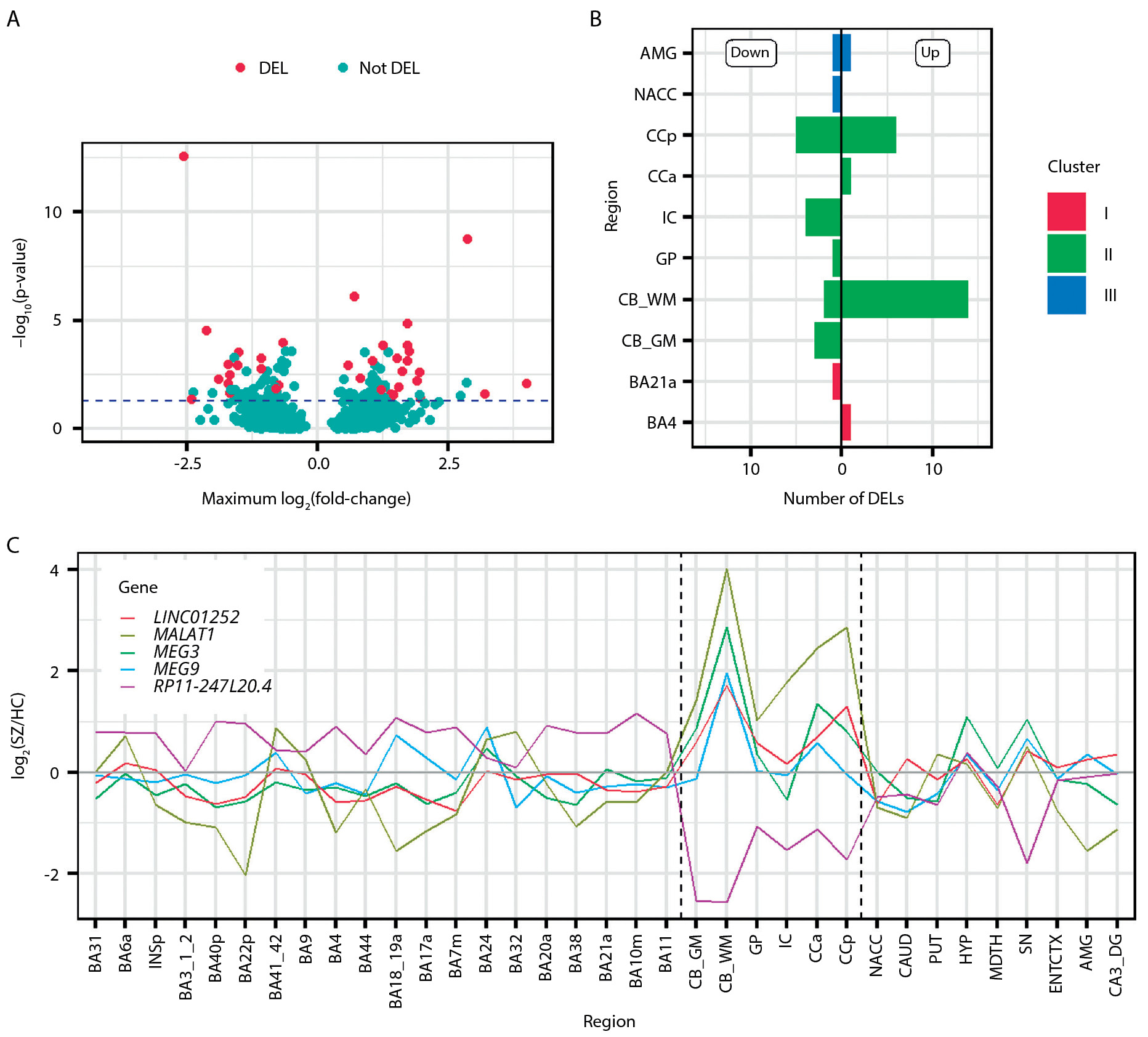 Figure 4. Differentially expressed lincRNAs (DELs) and the corresponding brain regions. Note: (A) A volcano plot showing 768 lincRNAs used in ANOVA with 37 DELs marked. The vertical axis shows the ANOVA BH-corrected p-value for the region-diagnosis interaction term. The dashed blue line indicates the threshold p=0.05. The plotted fold-change values represent the maximum fold-change among 35 regions for each lincRNA. (B) The number of down- and up-regulated DELs identified in each of the 10 brain regions containing at least one significant expression difference. Colors represent the brain region clusters shown in Figure 2C. (C) The profiles of the difference between the SZ and HC expression levels drawn for five DELs having the lowest SZ/HC comparison p-value, previously reported in the literature as SZ-associated, or both. The dashed black lines delineate the brain region cluster containing white-matter-rich regions.